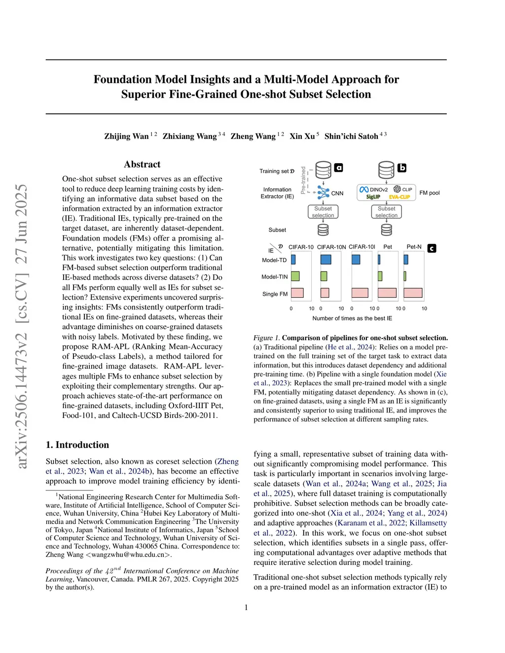 One-shot subset selection serves as an effective tool to reduce deep learning training costs by identifying an informative data subset based on the information extracted by an information extractor (IE). Traditional IEs, typically pre-trained on the target dataset, are inherently dataset-dependent. Foundation models (FMs) offer a promising alternative, potentially mitigating this limitation. This work investigates two key questions: (1) Can FM-based subset selection outperform traditional IE-based methods across diverse datasets? (2) Do all FMs perform equally well as IEs for subset selection? Extensive experiments uncovered surprising insights: FMs consistently outperform traditional IEs on fine-grained datasets, whereas their advantage diminishes on coarse-grained datasets with noisy labels. Motivated by these finding, we propose RAM-APL (RAnking Mean-Accuracy of Pseudo-class Labels), a method tailored for fine-grained image datasets. RAM-APL leverages multiple FMs to enhance subset selection by exploiting their complementary strengths. Our approach achieves state-of-the-art performance on fine-grained datasets, including Oxford-IIIT Pet, Food-101, and Caltech-UCSD Birds-200-2011.