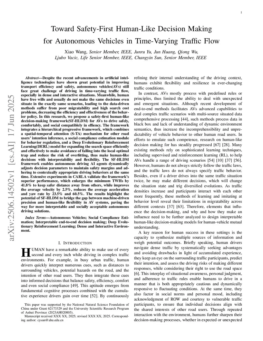 Despite the recent advancements in artificial intelligence technologies have shown great potential in improving transport efficiency and safety, autonomous vehicles(AVs) still face great challenge of driving in time-varying traffic flow, especially in dense and interactive situations. Meanwhile, human have free wills and usually do not make the same decisions even situate in the exactly same scenarios, leading to the data-driven methods suffer from poor migratability and high search cost problems, decreasing the efficiency and effectiveness of the behavior policy. In this research, we propose a safety-first human-like decision-making framework(SF-HLDM) for AVs to drive safely, comfortably, and social compatiblely in effiency. The framework integrates a hierarchical progressive framework, which combines a spatial-temporal attention (S-TA) mechanism for other road users' intention inference, a social compliance estimation module for behavior regulation, and a Deep Evolutionary Reinforcement Learning(DERL) model for expanding the search space efficiently and effectively to make avoidance of falling into the local optimal trap and reduce the risk of overfitting, thus make human-like decisions with interpretability and flexibility. The SF-HLDM framework enables autonomous driving AI agents dynamically adjusts decision parameters to maintain safety margins and adhering to contextually appropriate driving behaviors at the same time.