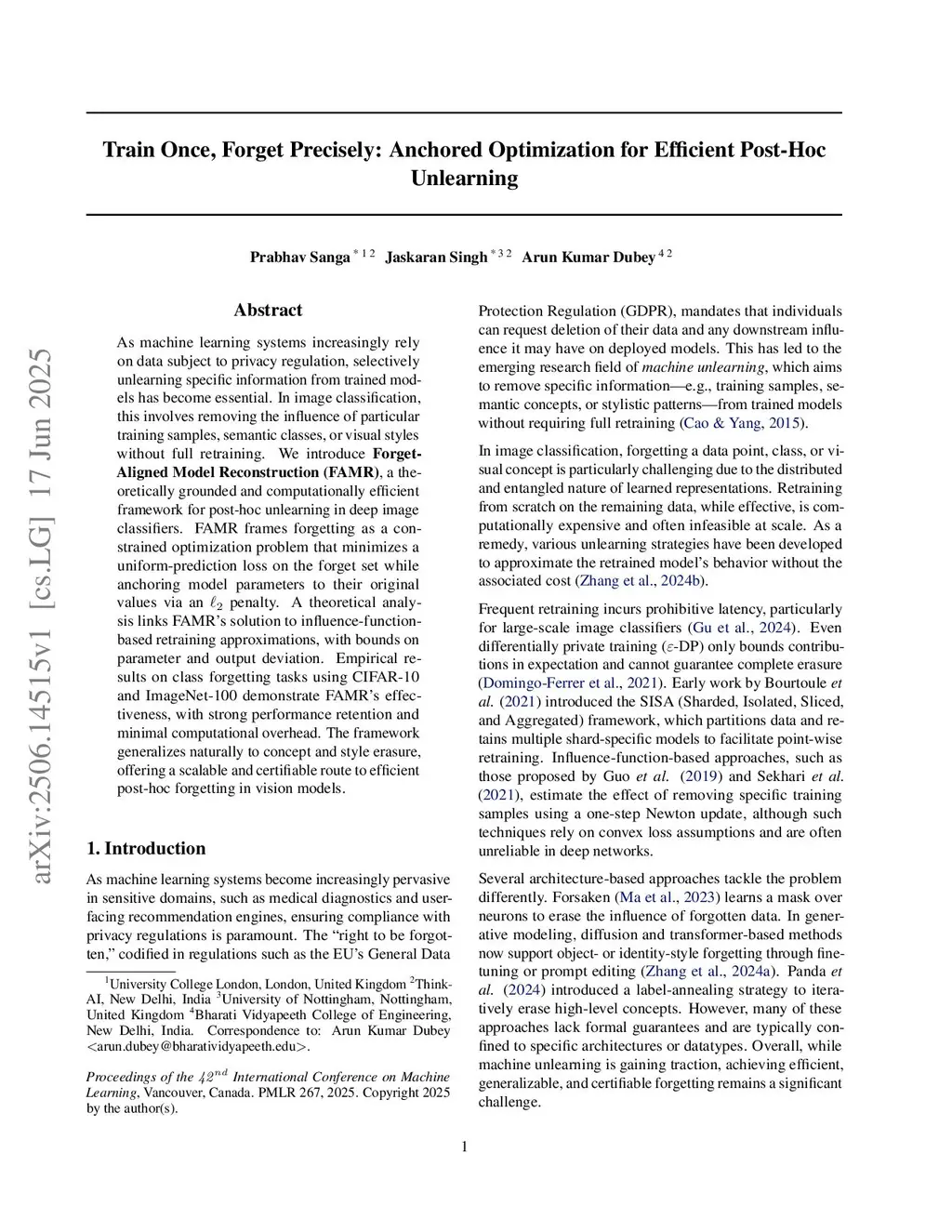 As machine learning systems increasingly rely on data subject to privacy regulation, selectively unlearning specific information from trained models has become essential. In image classification, this involves removing the influence of particular training samples, semantic classes, or visual styles without full retraining. We introduce \textbf{Forget-Aligned Model Reconstruction (FAMR)}, a theoretically grounded and computationally efficient framework for post-hoc unlearning in deep image classifiers. FAMR frames forgetting as a constrained optimization problem that minimizes a uniform-prediction loss on the forget set while anchoring model parameters to their original values via an penalty. A theoretical analysis links FAMR's solution to influence-function-based retraining approximations, with bounds on parameter and output deviation. Empirical results on class forgetting tasks using CIFAR-10 and ImageNet-100 demonstrate FAMR's effectiveness, with strong performance retention and minimal computational overhead. The framework generalizes naturally to concept and style erasure, offering a scalable and certifiable route to efficient post-hoc forgetting in vision models.
