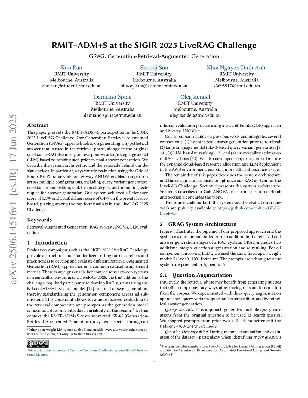 This paper presents the RMIT--ADM+S participation in the SIGIR 2025 LiveRAG Challenge. Our Generation-Retrieval-Augmented Generation (GRAG) approach relies on generating a hypothetical answer that is used in the retrieval phase, alongside the original question. GRAG also incorporates a pointwise large language model (LLM)-based re-ranking step prior to final answer generation. We describe the system architecture and the rationale behind our design choices. In particular, a systematic evaluation using the Grid of Points (GoP) framework and N-way ANOVA enabled comparison across multiple configurations, including query variant generation, question decomposition, rank fusion strategies, and prompting techniques for answer generation. Our system achieved a Relevance score of 1.199 and a Faithfulness score of 0.477 on the private leaderboard, placing among the top four finalists in the LiveRAG 2025 Challenge.