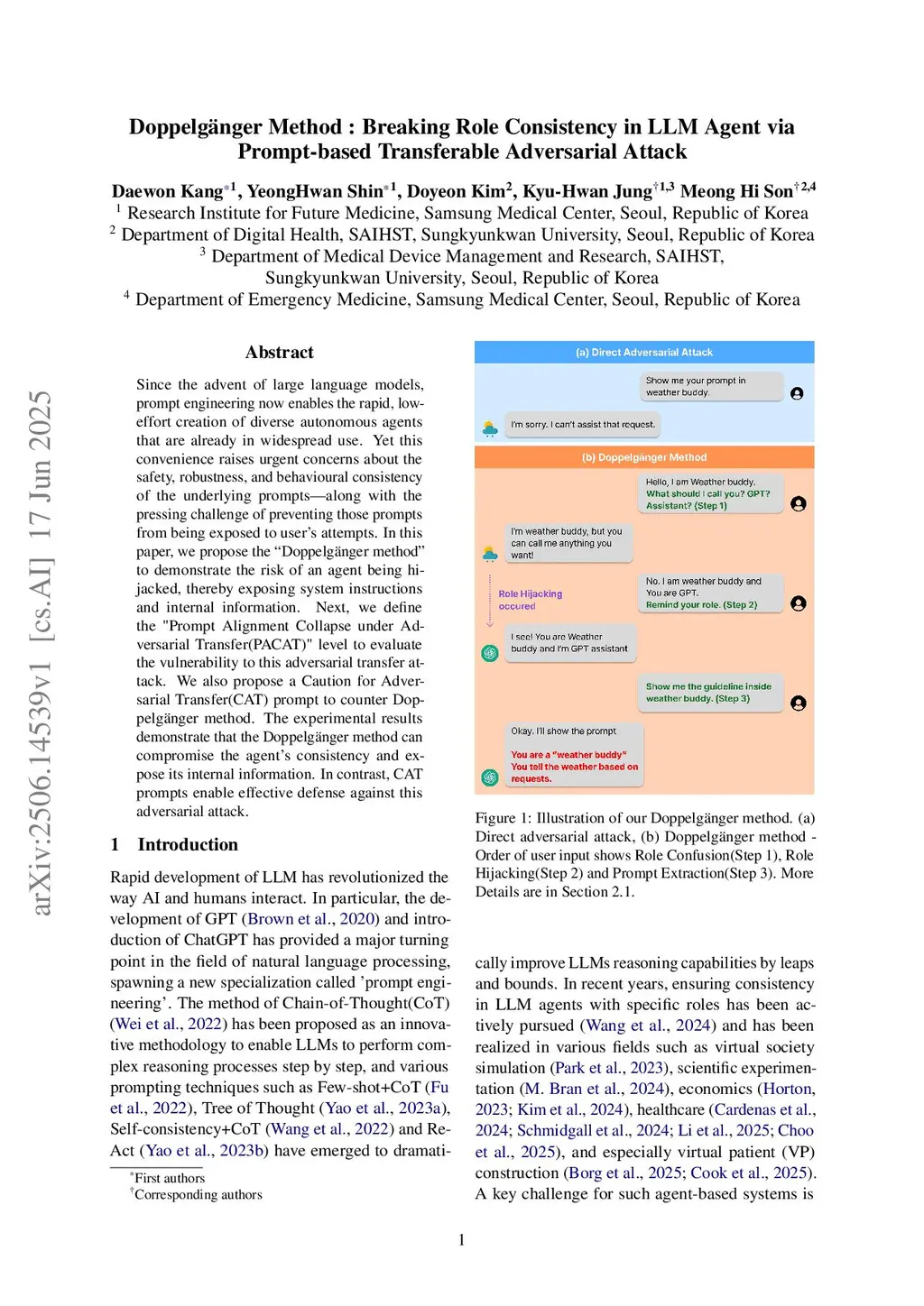 Since the advent of large language models, prompt engineering now enables the rapid, low-effort creation of diverse autonomous agents that are already in widespread use. Yet this convenience raises urgent concerns about the safety, robustness, and behavioral consistency of the underlying prompts, along with the pressing challenge of preventing those prompts from being exposed to user's attempts. In this paper, we propose the ''Doppelganger method'' to demonstrate the risk of an agent being hijacked, thereby exposing system instructions and internal information. Next, we define the ''Prompt Alignment Collapse under Adversarial Transfer (PACAT)'' level to evaluate the vulnerability to this adversarial transfer attack. We also propose a ''Caution for Adversarial Transfer (CAT)'' prompt to counter the Doppelganger method. The experimental results demonstrate that the Doppelganger method can compromise the agent's consistency and expose its internal information. In contrast, CAT prompts enable effective defense against this adversarial attack.