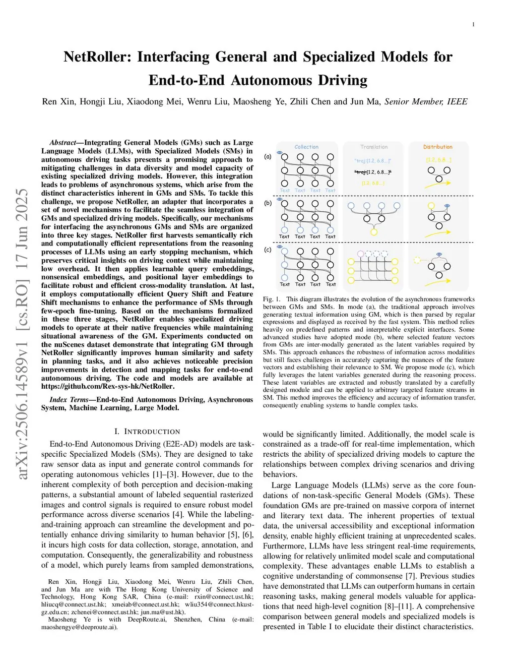 Integrating General Models (GMs) such as Large Language Models (LLMs), with Specialized Models (SMs) in autonomous driving tasks presents a promising approach to mitigating challenges in data diversity and model capacity of existing specialized driving models. However, this integration leads to problems of asynchronous systems, which arise from the distinct characteristics inherent in GMs and SMs. To tackle this challenge, we propose NetRoller, an adapter that incorporates a set of novel mechanisms to facilitate the seamless integration of GMs and specialized driving models. Specifically, our mechanisms for interfacing the asynchronous GMs and SMs are organized into three key stages. NetRoller first harvests semantically rich and computationally efficient representations from the reasoning processes of LLMs using an early stopping mechanism, which preserves critical insights on driving context while maintaining low overhead. It then applies learnable query embeddings, nonsensical embeddings, and positional layer embeddings to facilitate robust and efficient cross-modality translation. At last, it employs computationally efficient Query Shift and Feature Shift mechanisms to enhance the performance of SMs through few-epoch fine-tuning. Based on the mechanisms formalized in these three stages, NetRoller enables specialized driving models to operate at their native frequencies while maintaining situational awareness of the GM. Experiments conducted on the nuScenes dataset demonstrate that integrating GM through NetRoller significantly improves human similarity and safety in planning tasks, and it also achieves noticeable precision improvements in detection and mapping tasks for end-to-end autonomous driving. The code and models are available atthis https URL.