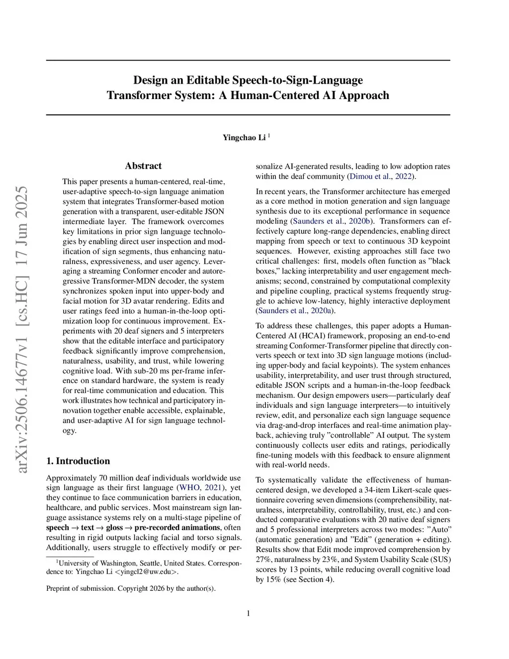 Existing end-to-end sign-language animation systems suffer from low naturalness, limited facial/body expressivity, and no user control. We propose a human-centered, real-time speech-to-sign animation framework that integrates (1) a streaming Conformer encoder with an autoregressive Transformer-MDN decoder for synchronized upper-body and facial motion generation, (2) a transparent, editable JSON intermediate representation empowering deaf users and experts to inspect and modify each sign segment, and (3) a human-in-the-loop optimization loop that refines the model based on user edits and ratings. Deployed on Unity3D, our system achieves a 13 ms average frame-inference time and a 103 ms end-to-end latency on an RTX 4070. Our key contributions include the design of a JSON-centric editing mechanism for fine-grained sign-level personalization and the first application of an MDN-based feedback loop for continuous model adaptation. This combination establishes a generalizable, explainable AI paradigm for user-adaptive, low-latency multimodal systems. In studies with 20 deaf signers and 5 professional interpreters, we observe a +13 point SUS improvement, 6.7 point reduction in cognitive load, and significant gains in naturalness and trust (p .001) over baselines. This work establishes a scalable, explainable AI paradigm for accessible sign-language technologies.