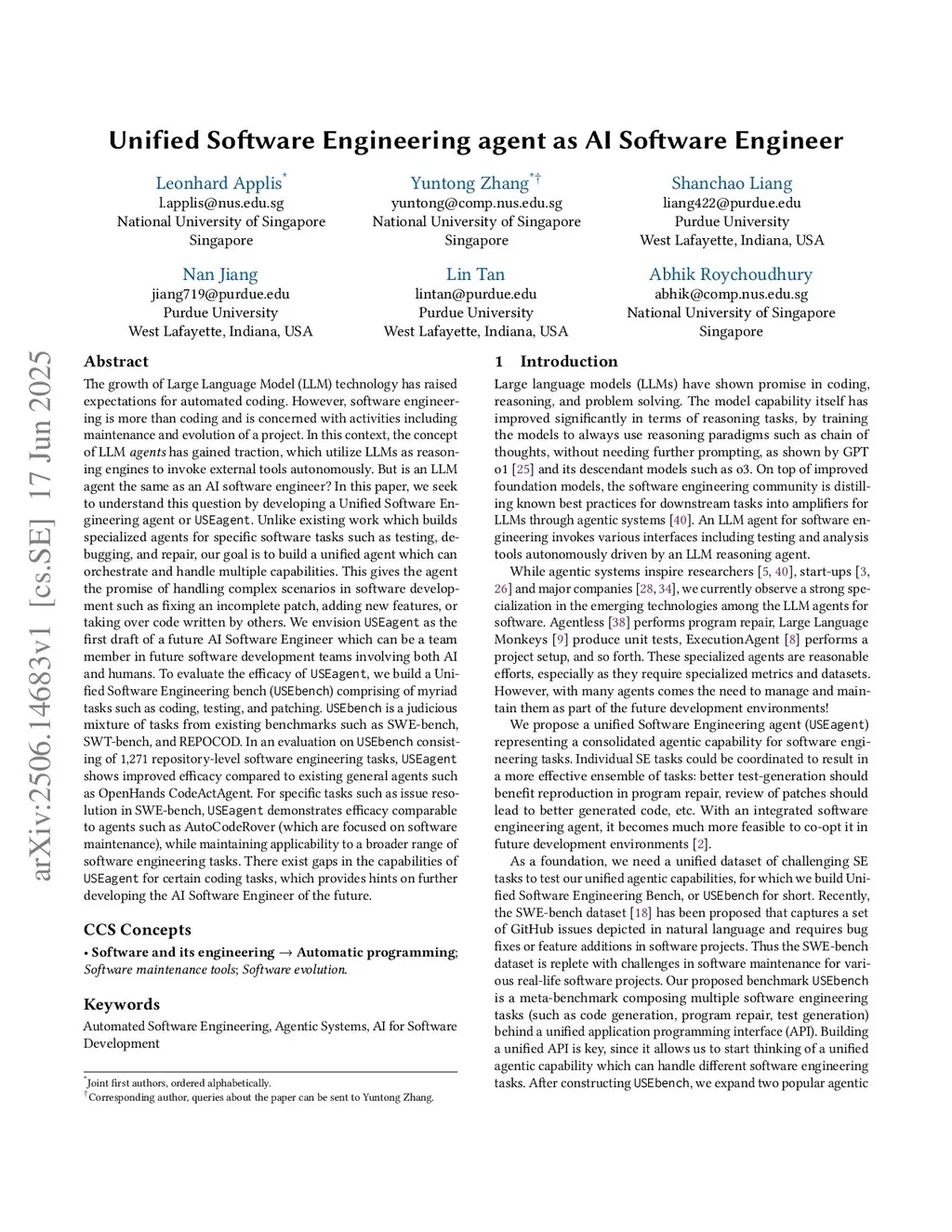 The growth of Large Language Model (LLM) technology has raised expectations for automated coding. However, software engineering is more than coding and is concerned with activities including maintenance and evolution of a project. In this context, the concept of LLM agents has gained traction, which utilize LLMs as reasoning engines to invoke external tools autonomously. But is an LLM agent the same as an AI software engineer? In this paper, we seek to understand this question by developing a Unified Software Engineering agent or USEagent. Unlike existing work which builds specialized agents for specific software tasks such as testing, debugging, and repair, our goal is to build a unified agent which can orchestrate and handle multiple capabilities. This gives the agent the promise of handling complex scenarios in software development such as fixing an incomplete patch, adding new features, or taking over code written by others. We envision USEagent as the first draft of a future AI Software Engineer which can be a team member in future software development teams involving both AI and humans. To evaluate the efficacy of USEagent, we build a Unified Software Engineering bench (USEbench) comprising of myriad tasks such as coding, testing, and patching. USEbench is a judicious mixture of tasks from existing benchmarks such as SWE-bench, SWT-bench, and REPOCOD. In an evaluation on USEbench consisting of 1,271 repository-level software engineering tasks, USEagent shows improved efficacy compared to existing general agents such as OpenHands CodeActAgent. There exist gaps in the capabilities of USEagent for certain coding tasks, which provides hints on further developing the AI Software Engineer of the future.