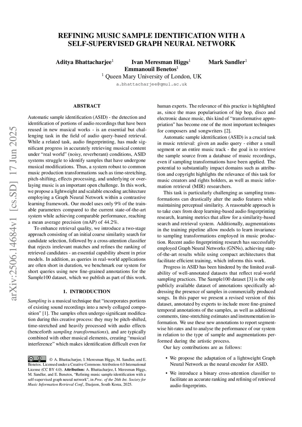 Automatic sample identification (ASID), the detection and identification of portions of audio recordings that have been reused in new musical works, is an essential but challenging task in the field of audio query-based retrieval. While a related task, audio fingerprinting, has made significant progress in accurately retrieving musical content under "real world" (noisy, reverberant) conditions, ASID systems struggle to identify samples that have undergone musical modifications. Thus, a system robust to common music production transformations such as time-stretching, pitch-shifting, effects processing, and underlying or overlaying music is an important open challenge.In this work, we propose a lightweight and scalable encoding architecture employing a Graph Neural Network within a contrastive learning framework. Our model uses only 9% of the trainable parameters compared to the current state-of-the-art system while achieving comparable performance, reaching a mean average precision (mAP) of 44.2%.To enhance retrieval quality, we introduce a two-stage approach consisting of an initial coarse similarity search for candidate selection, followed by a cross-attention classifier that rejects irrelevant matches and refines the ranking of retrieved candidates - an essential capability absent in prior models. In addition, because queries in real-world applications are often short in duration, we benchmark our system for short queries using new fine-grained annotations for the Sample100 dataset, which we publish as part of this work.