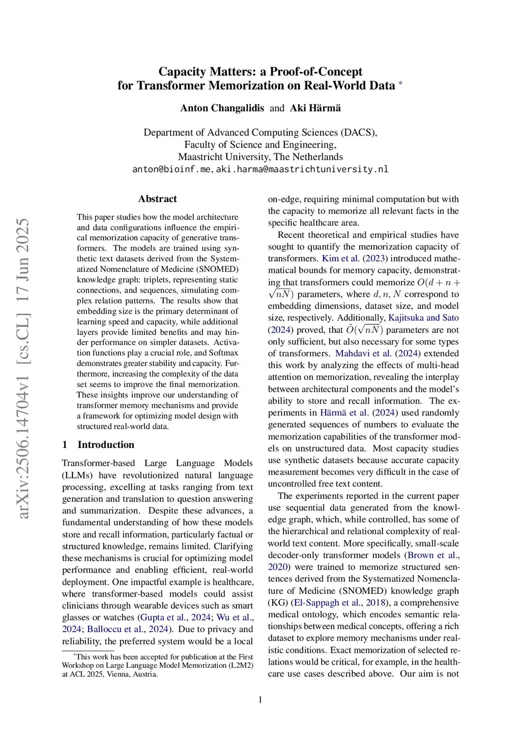 This paper studies how the model architecture and data configurations influence the empirical memorization capacity of generative transformers. The models are trained using synthetic text datasets derived from the Systematized Nomenclature of Medicine (SNOMED) knowledge graph: triplets, representing static connections, and sequences, simulating complex relation patterns. The results show that embedding size is the primary determinant of learning speed and capacity, while additional layers provide limited benefits and may hinder performance on simpler datasets. Activation functions play a crucial role, and Softmax demonstrates greater stability and capacity. Furthermore, increasing the complexity of the data set seems to improve the final memorization. These insights improve our understanding of transformer memory mechanisms and provide a framework for optimizing model design with structured real-world data.