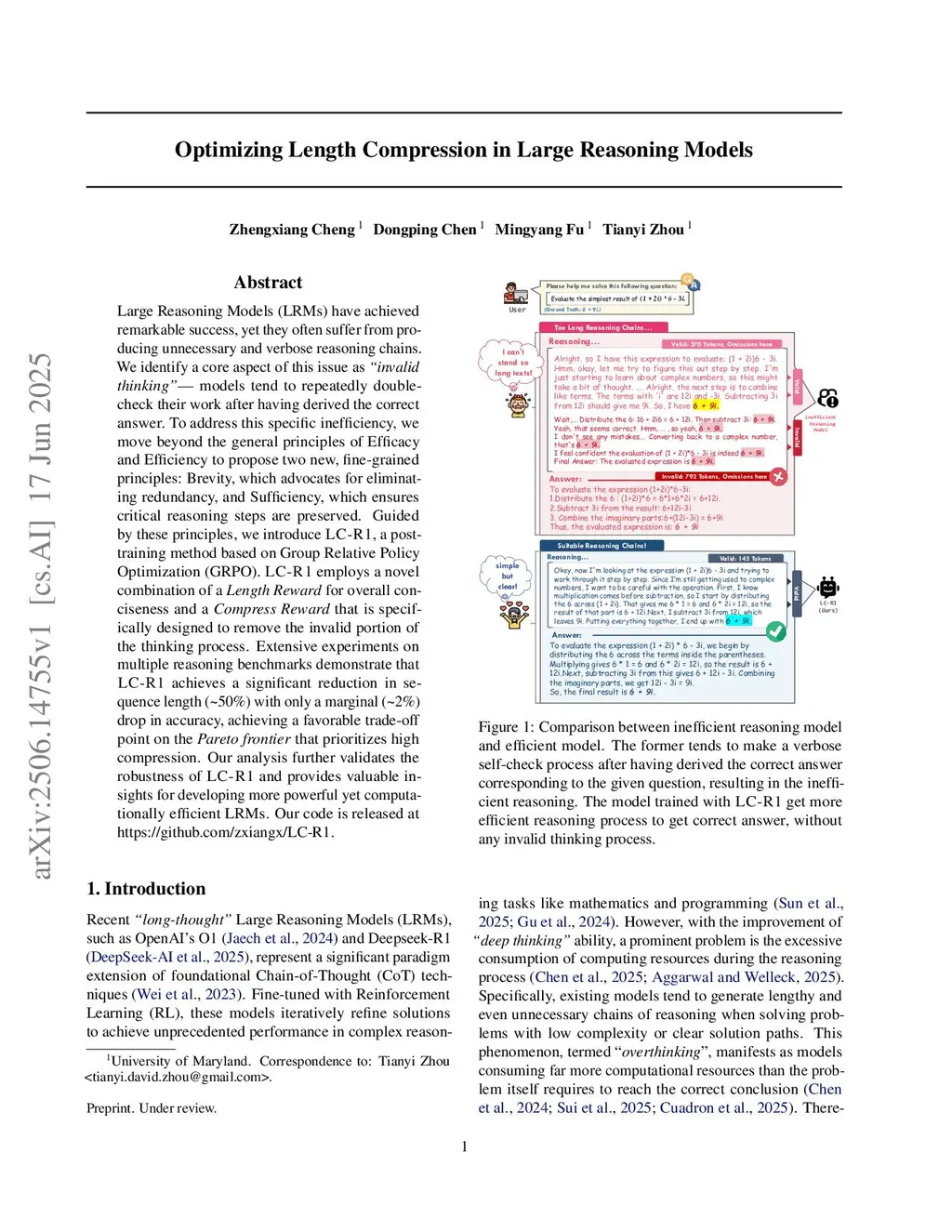 Large Reasoning Models (LRMs) have achieved remarkable success, yet they often suffer from producing unnecessary and verbose reasoning chains. We identify a core aspect of this issue as "invalid thinking" -- models tend to repeatedly double-check their work after having derived the correct answer. To address this specific inefficiency, we move beyond the general principles of Efficacy and Efficiency to propose two new, fine-grained principles: Brevity, which advocates for eliminating redundancy, and Sufficiency, which ensures critical reasoning steps are preserved. Guided by these principles, we introduce LC-R1, a post-training method based on Group Relative Policy Optimization (GRPO). LC-R1 employs a novel combination of a Length Reward for overall conciseness and a Compress Reward that is specifically designed to remove the invalid portion of the thinking process. Extensive experiments on multiple reasoning benchmarks demonstrate that LC-R1 achieves a significant reduction in sequence length (~50%) with only a marginal (~2%) drop in accuracy, achieving a favorable trade-off point on the Pareto frontier that prioritizes high compression. Our analysis further validates the robustness of LC-R1 and provides valuable insights for developing more powerful yet computationally efficient LRMs. Our code is released atthis https URL.