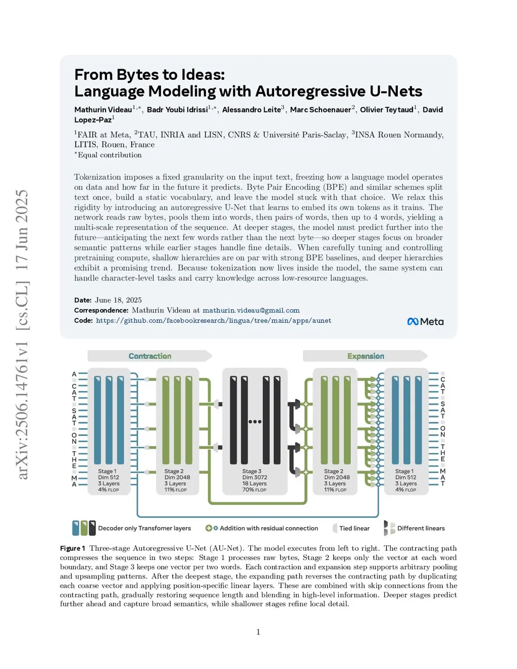 Tokenization imposes a fixed granularity on the input text, freezing how a language model operates on data and how far in the future it predicts. Byte Pair Encoding (BPE) and similar schemes split text once, build a static vocabulary, and leave the model stuck with that choice. We relax this rigidity by introducing an autoregressive U-Net that learns to embed its own tokens as it trains. The network reads raw bytes, pools them into words, then pairs of words, then up to 4 words, giving it a multi-scale view of the sequence. At deeper stages, the model must predict further into the future -- anticipating the next few words rather than the next byte -- so deeper stages focus on broader semantic patterns while earlier stages handle fine details. When carefully tuning and controlling pretraining compute, shallow hierarchies tie strong BPE baselines, and deeper hierarchies have a promising trend. Because tokenization now lives inside the model, the same system can handle character-level tasks and carry knowledge across low-resource languages.