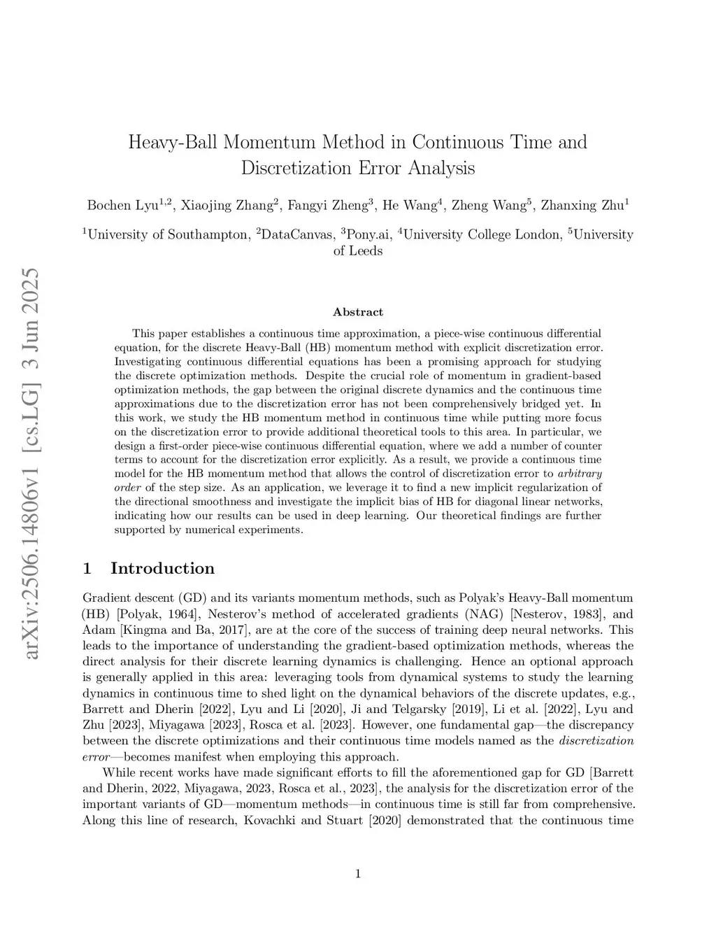 This paper establishes a continuous time approximation, a piece-wise continuous differential equation, for the discrete Heavy-Ball (HB) momentum method with explicit discretization error. Investigating continuous differential equations has been a promising approach for studying the discrete optimization methods. Despite the crucial role of momentum in gradient-based optimization methods, the gap between the original discrete dynamics and the continuous time approximations due to the discretization error has not been comprehensively bridged yet. In this work, we study the HB momentum method in continuous time while putting more focus on the discretization error to provide additional theoretical tools to this area. In particular, we design a first-order piece-wise continuous differential equation, where we add a number of counter terms to account for the discretization error explicitly. As a result, we provide a continuous time model for the HB momentum method that allows the control of discretization error to arbitrary order of the step size. As an application, we leverage it to find a new implicit regularization of the directional smoothness and investigate the implicit bias of HB for diagonal linear networks, indicating how our results can be used in deep learning. Our theoretical findings are further supported by numerical experiments.