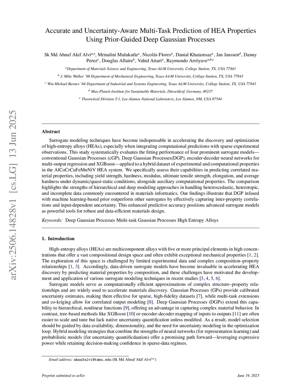 Surrogate modeling techniques have become indispensable in accelerating the discovery and optimization of high-entropy alloys(HEAs), especially when integrating computational predictions with sparse experimental observations. This study systematically evaluates the fitting performance of four prominent surrogate models conventional Gaussian Processes(cGP), Deep Gaussian Processes(DGP), encoder-decoder neural networks for multi-output regression and XGBoost applied to a hybrid dataset of experimental and computational properties in the AlCoCrCuFeMnNiV HEA system. We specifically assess their capabilities in predicting correlated material properties, including yield strength, hardness, modulus, ultimate tensile strength, elongation, and average hardness under dynamic and quasi-static conditions, alongside auxiliary computational properties. The comparison highlights the strengths of hierarchical and deep modeling approaches in handling heteroscedastic, heterotopic, and incomplete data commonly encountered in materials informatics. Our findings illustrate that DGP infused with machine learning-based prior outperform other surrogates by effectively capturing inter-property correlations and input-dependent uncertainty. This enhanced predictive accuracy positions advanced surrogate models as powerful tools for robust and data-efficient materials design.