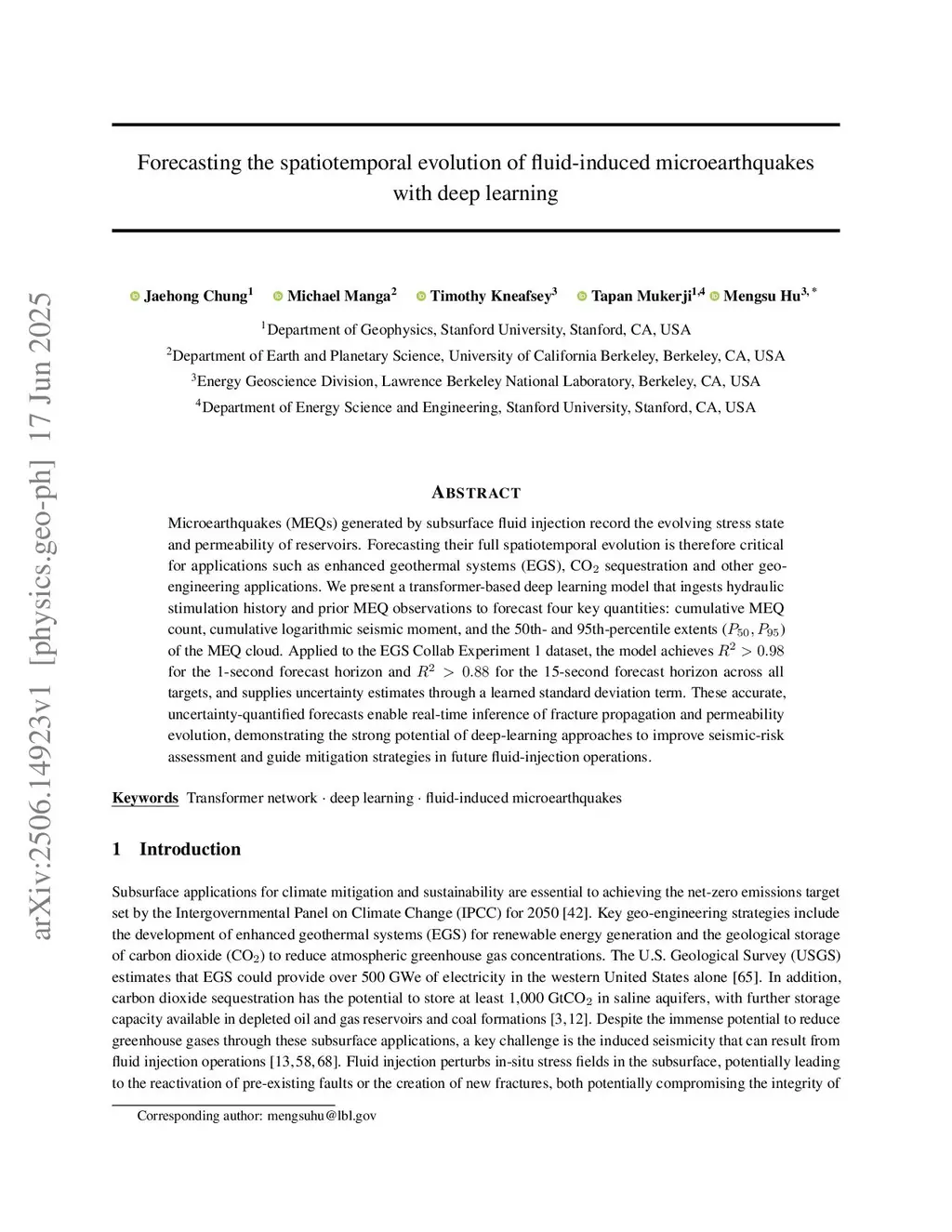 Microearthquakes (MEQs) generated by subsurface fluid injection record the evolving stress state and permeability of reservoirs. Forecasting their full spatiotemporal evolution is therefore critical for applications such as enhanced geothermal systems (EGS), CO sequestration and other geo-engineering applications. We present a transformer-based deep learning model that ingests hydraulic stimulation history and prior MEQ observations to forecast four key quantities: cumulative MEQ count, cumulative logarithmic seismic moment, and the 50th- and 95th-percentile extents () of the MEQ cloud. Applied to the EGS Collab Experiment 1 dataset, the model achieves for the 1-second forecast horizon and for the 15-second forecast horizon across all targets, and supplies uncertainty estimates through a learned standard deviation term. These accurate, uncertainty-quantified forecasts enable real-time inference of fracture propagation and permeability evolution, demonstrating the strong potential of deep-learning approaches to improve seismic-risk assessment and guide mitigation strategies in future fluid-injection operations.