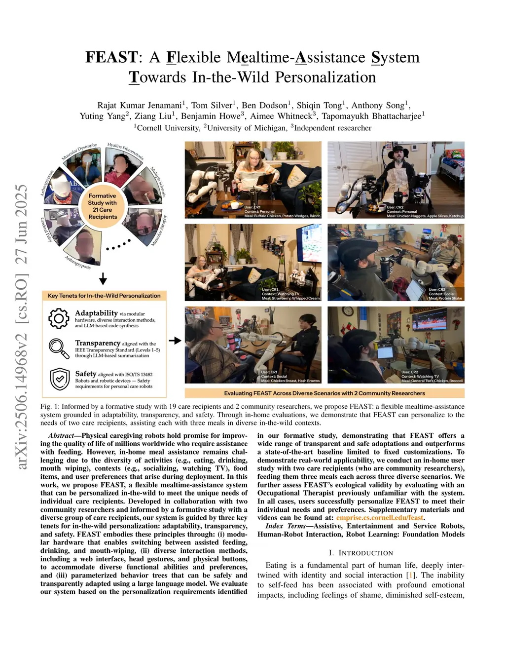 Physical caregiving robots hold promise for improving the quality of life of millions worldwide who require assistance with feeding. However, in-home meal assistance remains challenging due to the diversity of activities (e.g., eating, drinking, mouth wiping), contexts (e.g., socializing, watching TV), food items, and user preferences that arise during deployment. In this work, we propose FEAST, a flexible mealtime-assistance system that can be personalized in-the-wild to meet the unique needs of individual care recipients. Developed in collaboration with two community researchers and informed by a formative study with a diverse group of care recipients, our system is guided by three key tenets for in-the-wild personalization: adaptability, transparency, and safety. FEAST embodies these principles through: (i) modular hardware that enables switching between assisted feeding, drinking, and mouth-wiping, (ii) diverse interaction methods, including a web interface, head gestures, and physical buttons, to accommodate diverse functional abilities and preferences, and (iii) parameterized behavior trees that can be safely and transparently adapted using a large language model. We evaluate our system based on the personalization requirements identified in our formative study, demonstrating that FEAST offers a wide range of transparent and safe adaptations and outperforms a state-of-the-art baseline limited to fixed customizations. To demonstrate real-world applicability, we conduct an in-home user study with two care recipients (who are community researchers), feeding them three meals each across three diverse scenarios. We further assess FEAST's ecological validity by evaluating with an Occupational Therapist previously unfamiliar with the system. In all cases, users successfully personalize FEAST to meet their individual needs and preferences. Website:this https URL