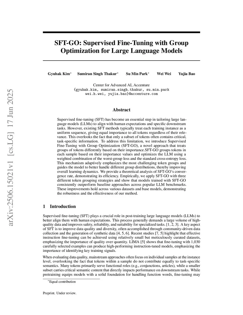 Supervised fine-tuning (SFT) has become an essential step in tailoring large language models (LLMs) to align with human expectations and specific downstream tasks. However, existing SFT methods typically treat each training instance as a uniform sequence, giving equal importance to all tokens regardless of their relevance. This overlooks the fact that only a subset of tokens often contains critical, task-specific information. To address this limitation, we introduce Supervised Fine-Tuning with Group Optimization (SFT-GO), a novel approach that treats groups of tokens differently based on theirthis http URL-GO groups tokens in each sample based on their importance values and optimizes the LLM using a weighted combination of the worst-group loss and the standard cross-entropy loss. This mechanism adaptively emphasizes the most challenging token groups and guides the model to better handle different group distributions, thereby improving overall learning dynamics. We provide a theoretical analysis of SFT-GO's convergence rate, demonstrating its efficiency. Empirically, we apply SFT-GO with three different token grouping strategies and show that models trained with SFT-GO consistently outperform baseline approaches across popular LLM benchmarks. These improvements hold across various datasets and base models, demonstrating the robustness and the effectiveness of our method.