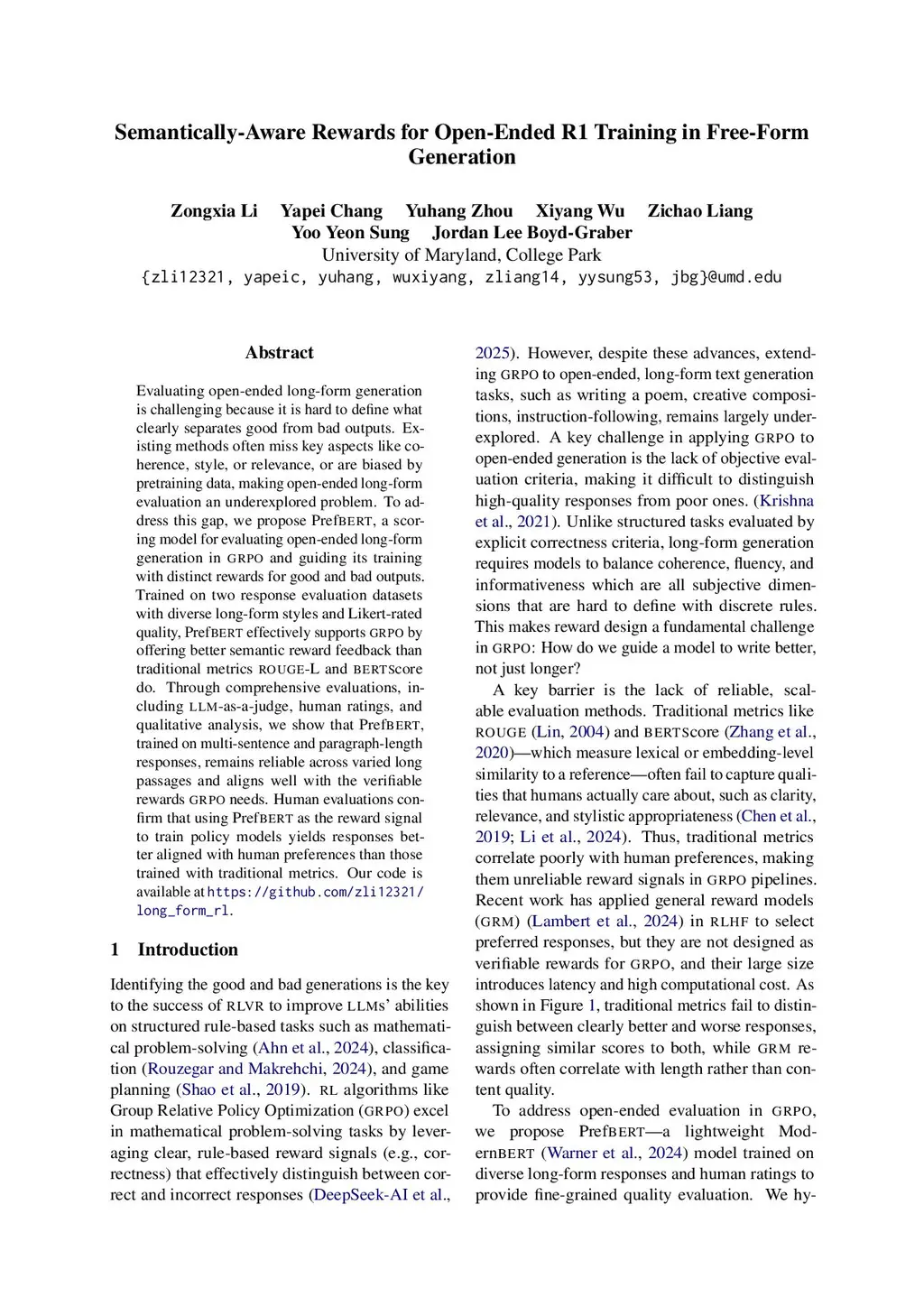 Evaluating open-ended long-form generation is challenging because it is hard to define what clearly separates good from bad outputs. Existing methods often miss key aspects like coherence, style, or relevance, or are biased by pretraining data, making open-ended long-form evaluation an underexplored problem. To address this gap, we propose PrefBERT, a scoring model for evaluating open-ended long-form generation in GRPO and guiding its training with distinct rewards for good and bad outputs. Trained on two response evaluation datasets with diverse long-form styles and Likert-rated quality, PrefBERT effectively supports GRPO by offering better semantic reward feedback than traditional metrics ROUGE-L and BERTScore do. Through comprehensive evaluations, including LLM-as-a-judge, human ratings, and qualitative analysis, we show that PrefBERT, trained on multi-sentence and paragraph-length responses, remains reliable across varied long passages and aligns well with the verifiable rewards GRPO needs. Human evaluations confirm that using PrefBERT as the reward signal to train policy models yields responses better aligned with human preferences than those trained with traditional metrics. Our code is available atthis https URL.