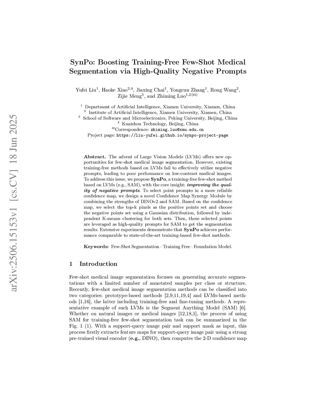 The advent of Large Vision Models (LVMs) offers new opportunities for few-shot medical image segmentation. However, existing training-free methods based on LVMs fail to effectively utilize negative prompts, leading to poor performance on low-contrast medical images. To address this issue, we propose SynPo, a training-free few-shot method based on LVMs (e.g., SAM), with the core insight: improving the quality of negative prompts. To select point prompts in a more reliable confidence map, we design a novel Confidence Map Synergy Module by combining the strengths of DINOv2 and SAM. Based on the confidence map, we select the top-k pixels as the positive points set and choose the negative points set using a Gaussian distribution, followed by independent K-means clustering for both sets. Then, these selected points are leveraged as high-quality prompts for SAM to get the segmentation results. Extensive experiments demonstrate that SynPo achieves performance comparable to state-of-the-art training-based few-shot methods.