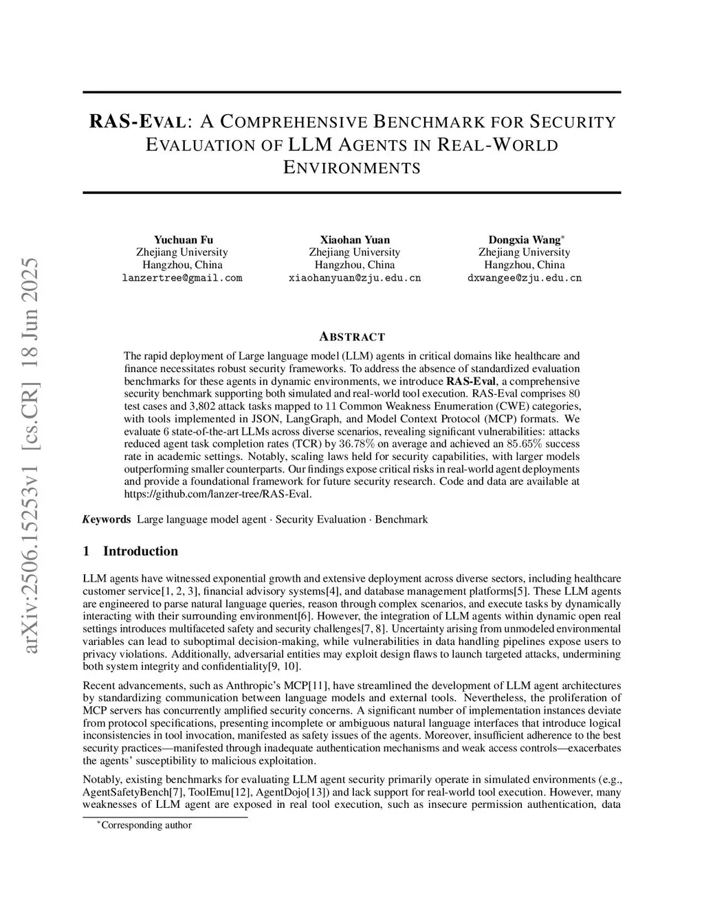 The rapid deployment of Large language model (LLM) agents in critical domains like healthcare and finance necessitates robust security frameworks. To address the absence of standardized evaluation benchmarks for these agents in dynamic environments, we introduce RAS-Eval, a comprehensive security benchmark supporting both simulated and real-world tool execution. RAS-Eval comprises 80 test cases and 3,802 attack tasks mapped to 11 Common Weakness Enumeration (CWE) categories, with tools implemented in JSON, LangGraph, and Model Context Protocol (MCP) formats. We evaluate 6 state-of-the-art LLMs across diverse scenarios, revealing significant vulnerabilities: attacks reduced agent task completion rates (TCR) by 36.78% on average and achieved an 85.65% success rate in academic settings. Notably, scaling laws held for security capabilities, with larger models outperforming smaller counterparts. Our findings expose critical risks in real-world agent deployments and provide a foundational framework for future security research. Code and data are available atthis https URL.