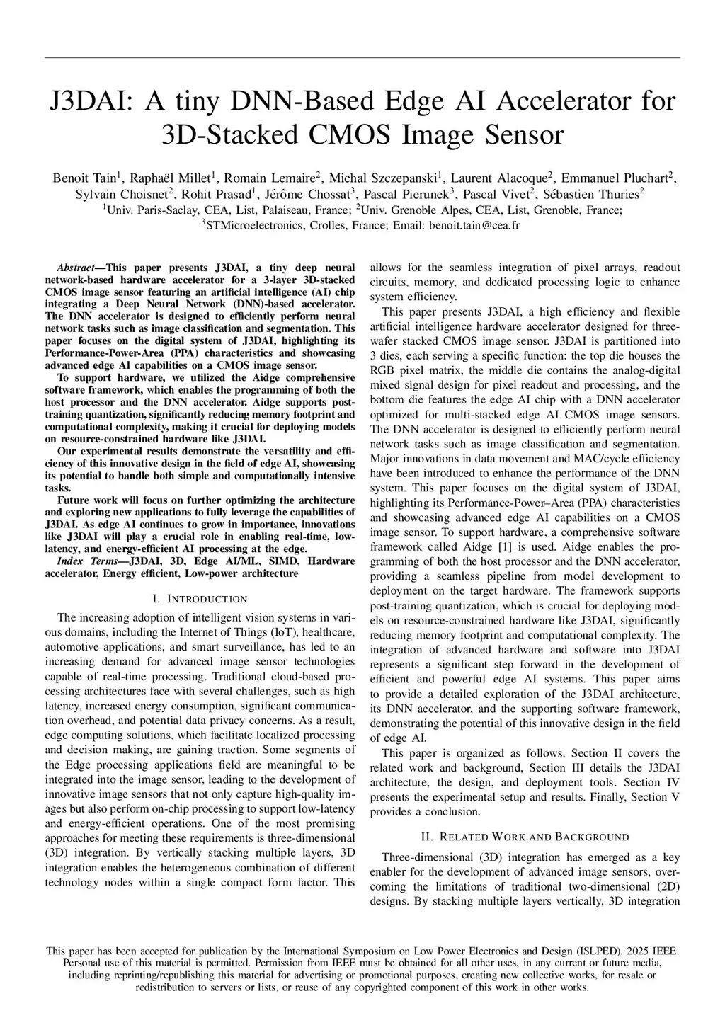 This paper presents J3DAI, a tiny deep neural network-based hardware accelerator for a 3-layer 3D-stacked CMOS image sensor featuring an artificial intelligence (AI) chip integrating a Deep Neural Network (DNN)-based accelerator. The DNN accelerator is designed to efficiently perform neural network tasks such as image classification and segmentation. This paper focuses on the digital system of J3DAI, highlighting its Performance-Power-Area (PPA) characteristics and showcasing advanced edge AI capabilities on a CMOS image sensor. To support hardware, we utilized the Aidge comprehensive software framework, which enables the programming of both the host processor and the DNN accelerator. Aidge supports post-training quantization, significantly reducing memory footprint and computational complexity, making it crucial for deploying models on resource-constrained hardware like J3DAI. Our experimental results demonstrate the versatility and efficiency of this innovative design in the field of edge AI, showcasing its potential to handle both simple and computationally intensive tasks. Future work will focus on further optimizing the architecture and exploring new applications to fully leverage the capabilities of J3DAI. As edge AI continues to grow in importance, innovations like J3DAI will play a crucial role in enabling real-time, low-latency, and energy-efficient AI processing at the edge.