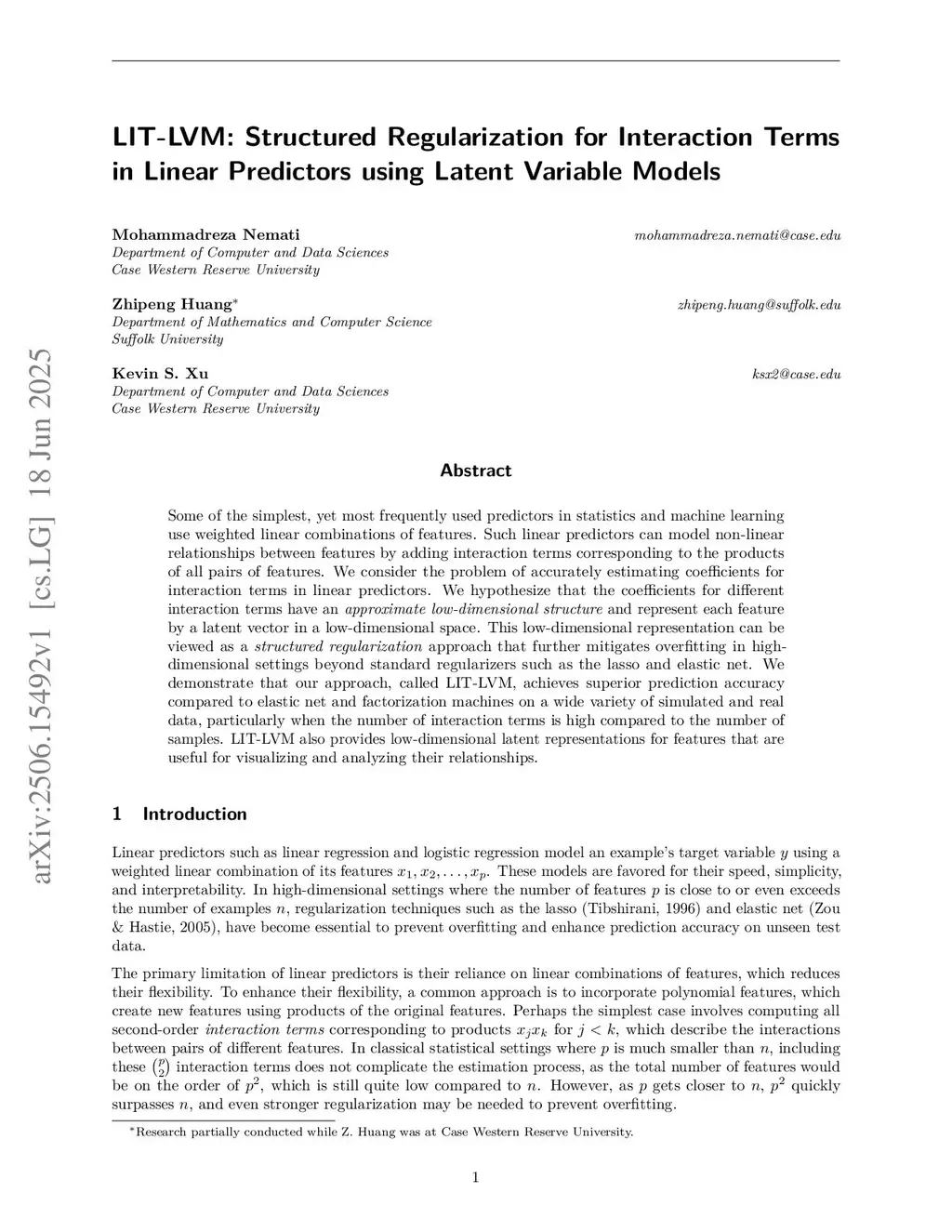 Some of the simplest, yet most frequently used predictors in statistics and machine learning use weighted linear combinations of features. Such linear predictors can model non-linear relationships between features by adding interaction terms corresponding to the products of all pairs of features. We consider the problem of accurately estimating coefficients for interaction terms in linear predictors. We hypothesize that the coefficients for different interaction terms have an approximate low-dimensional structure and represent each feature by a latent vector in a low-dimensional space. This low-dimensional representation can be viewed as a structured regularization approach that further mitigates overfitting in high-dimensional settings beyond standard regularizers such as the lasso and elastic net. We demonstrate that our approach, called LIT-LVM, achieves superior prediction accuracy compared to the elastic net, hierarchical lasso, and factorization machines on a wide variety of simulated and real data, particularly when the number of interaction terms is high compared to the number of samples. LIT-LVM also provides low-dimensional latent representations for features that are useful for visualizing and analyzing their relationships.