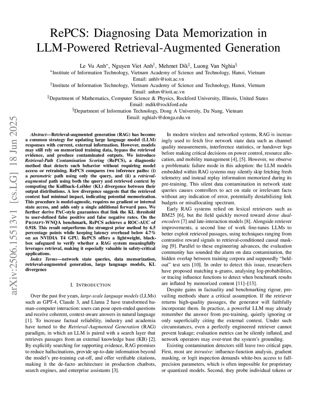 Retrieval-augmented generation (RAG) has become a common strategy for updating large language model (LLM) responses with current, external information. However, models may still rely on memorized training data, bypass the retrieved evidence, and produce contaminated outputs. We introduce Retrieval-Path Contamination Scoring (RePCS), a diagnostic method that detects such behavior without requiring model access or retraining. RePCS compares two inference paths: (i) a parametric path using only the query, and (ii) a retrieval-augmented path using both the query and retrieved context by computing the Kullback-Leibler (KL) divergence between their output distributions. A low divergence suggests that the retrieved context had minimal impact, indicating potential memorization. This procedure is model-agnostic, requires no gradient or internal state access, and adds only a single additional forward pass. We further derive PAC-style guarantees that link the KL threshold to user-defined false positive and false negative rates. On the Prompt-WNQA benchmark, RePCS achieves a ROC-AUC of 0.918. This result outperforms the strongest prior method by 6.5 percentage points while keeping latency overhead below 4.7% on an NVIDIA T4 GPU. RePCS offers a lightweight, black-box safeguard to verify whether a RAG system meaningfully leverages retrieval, making it especially valuable in safety-critical applications.
