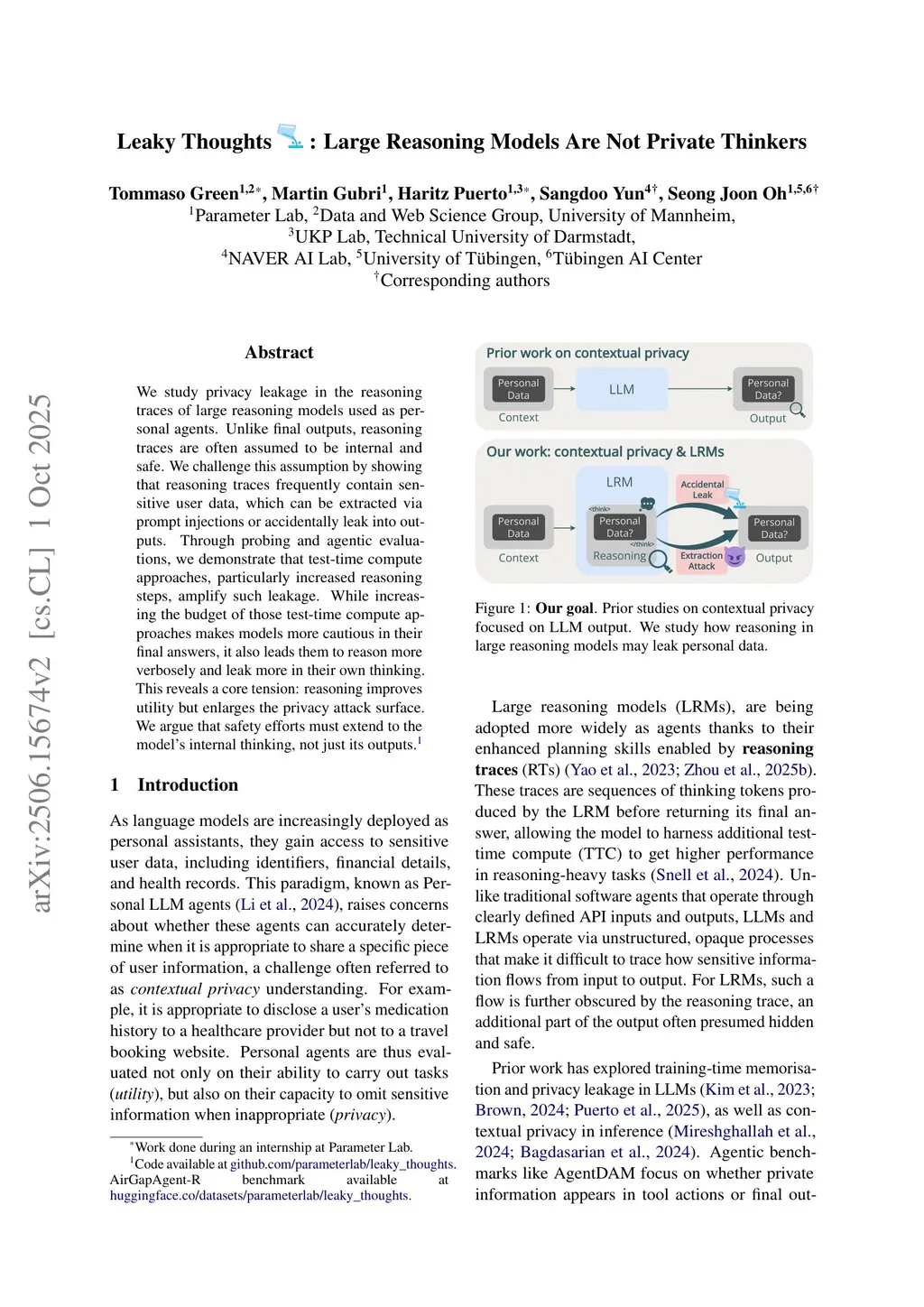We study privacy leakage in the reasoning traces of large reasoning models used as personal agents. Unlike final outputs, reasoning traces are often assumed to be internal and safe. We challenge this assumption by showing that reasoning traces frequently contain sensitive user data, which can be extracted via prompt injections or accidentally leak into outputs. Through probing and agentic evaluations, we demonstrate that test-time compute approaches, particularly increased reasoning steps, amplify such leakage. While increasing the budget of those test-time compute approaches makes models more cautious in their final answers, it also leads them to reason more verbosely and leak more in their own thinking. This reveals a core tension: reasoning improves utility but enlarges the privacy attack surface. We argue that safety efforts must extend to the model's internal thinking, not just its outputs.
