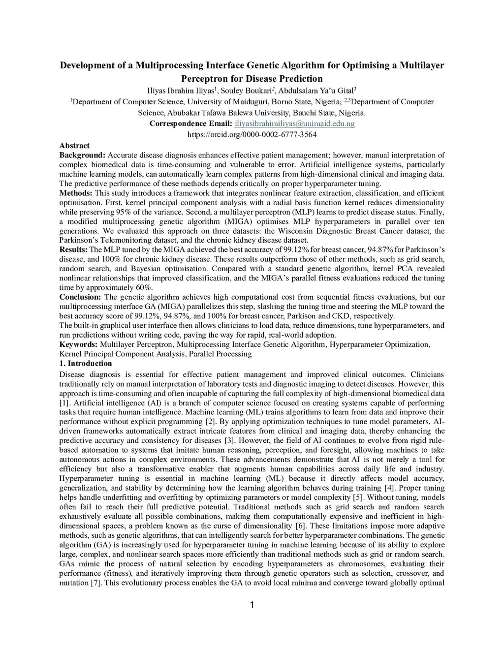 Development of a Multiprocessing Interface Genetic Algorithm for Optimising a Multilayer Perceptron for Disease Prediction