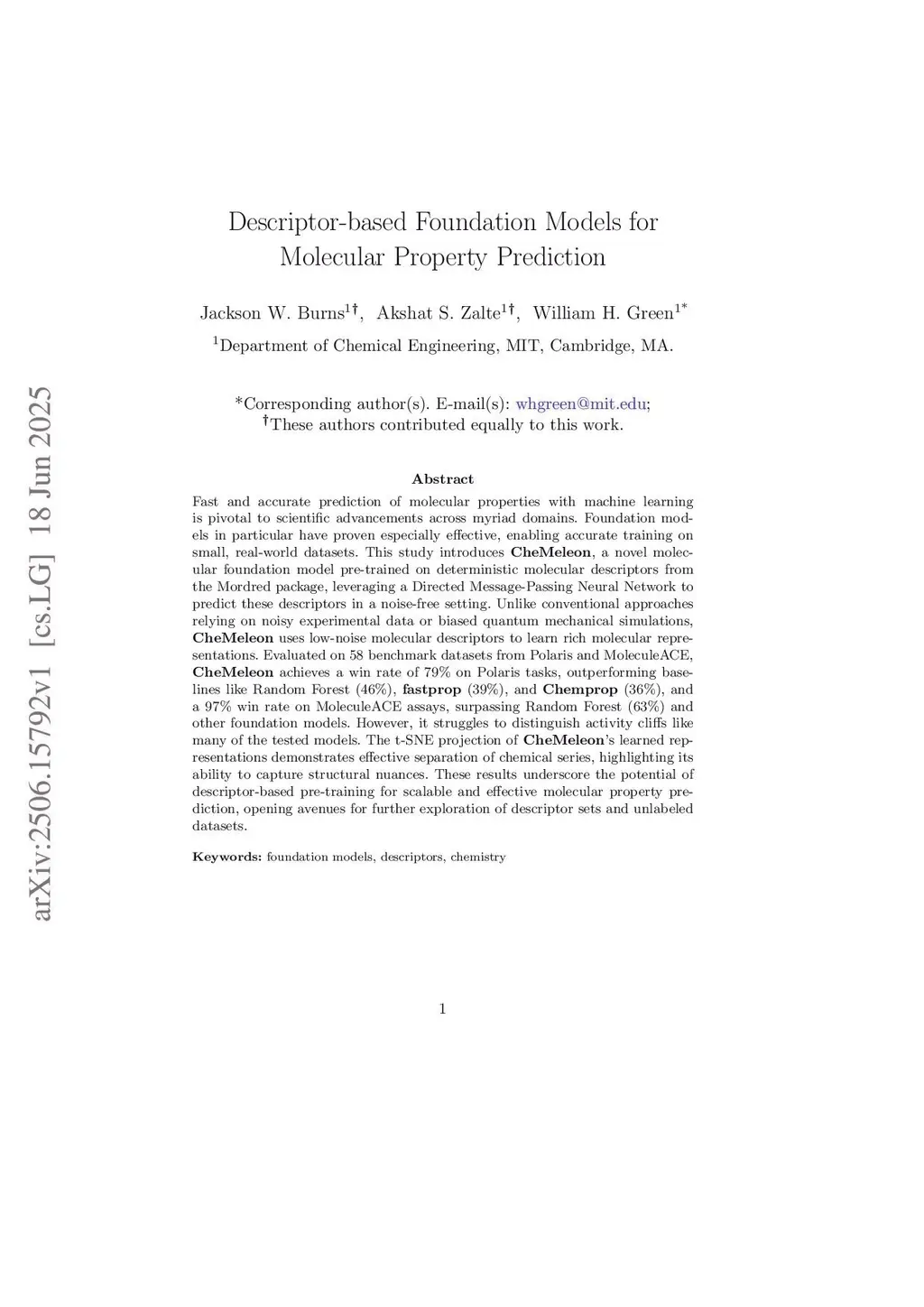 Fast and accurate prediction of molecular properties with machine learning is pivotal to scientific advancements across myriad domains. Foundation models in particular have proven especially effective, enabling accurate training on small, real-world datasets. This study introduces CheMeleon, a novel molecular foundation model pre-trained on deterministic molecular descriptors from the Mordred package, leveraging a Directed Message-Passing Neural Network to predict these descriptors in a noise-free setting. Unlike conventional approaches relying on noisy experimental data or biased quantum mechanical simulations, CheMeleon uses low-noise molecular descriptors to learn rich molecular representations. Evaluated on 58 benchmark datasets from Polaris and MoleculeACE, CheMeleon achieves a win rate of 79% on Polaris tasks, outperforming baselines like Random Forest (46%), fastprop (39%), and Chemprop (36%), and a 97% win rate on MoleculeACE assays, surpassing Random Forest (63%) and other foundation models. However, it struggles to distinguish activity cliffs like many of the tested models. The t-SNE projection of CheMeleon's learned representations demonstrates effective separation of chemical series, highlighting its ability to capture structural nuances. These results underscore the potential of descriptor-based pre-training for scalable and effective molecular property prediction, opening avenues for further exploration of descriptor sets and unlabeled datasets.
