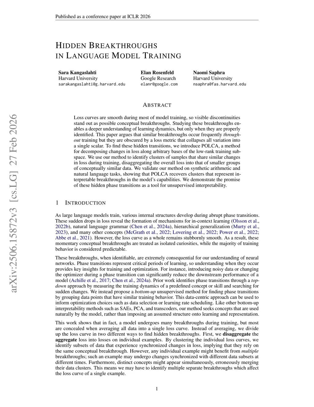 Loss curves are smooth during most of model training, so visible discontinuities stand out as possible conceptual breakthroughs. Studying these breakthroughs enables a deeper understanding of learning dynamics, but only when they are properly identified. This paper argues that similar breakthroughs occur frequently throughout training but they are obscured by a loss metric that collapses all variation into a single scalar. To find these hidden transitions, we introduce POLCA, a method for decomposing changes in loss along arbitrary bases of the low-rank training subspace. We use our method to identify clusters of samples that share similar changes in loss during training, disaggregating the overall loss into that of smaller groups of conceptually similar data. We validate our method on synthetic arithmetic and natural language tasks, showing that POLCA recovers clusters that represent interpretable breakthroughs in the model's capabilities. We demonstrate the promise of these hidden phase transitions as a tool for unsupervised interpretability.