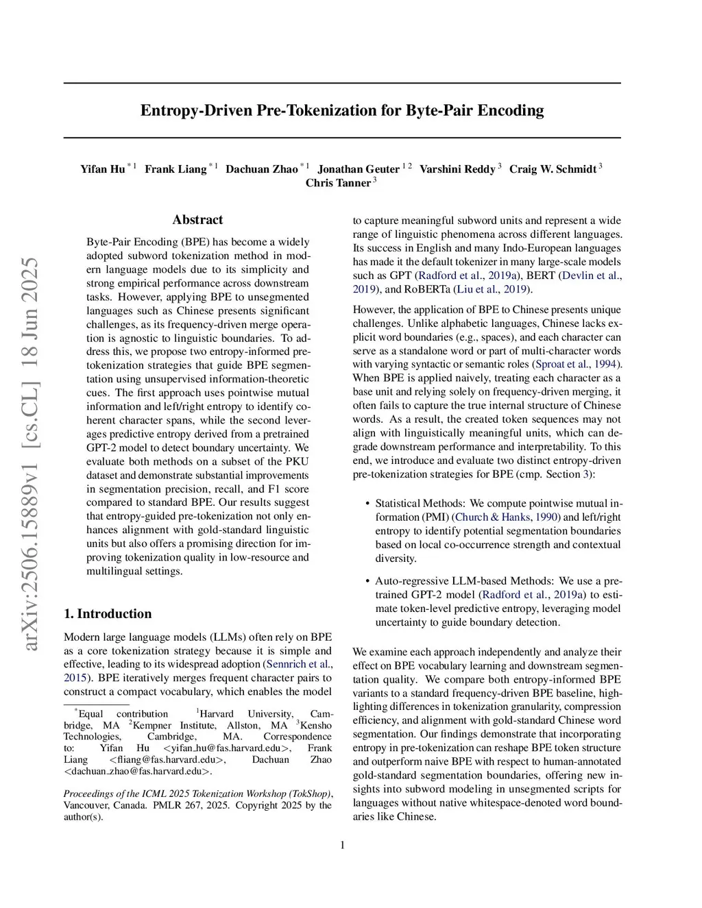 Byte-Pair Encoding (BPE) has become a widely adopted subword tokenization method in modern language models due to its simplicity and strong empirical performance across downstream tasks. However, applying BPE to unsegmented languages such as Chinese presents significant challenges, as its frequency-driven merge operation is agnostic to linguistic boundaries. To address this, we propose two entropy-informed pre-tokenization strategies that guide BPE segmentation using unsupervised information-theoretic cues. The first approach uses pointwise mutual information and left/right entropy to identify coherent character spans, while the second leverages predictive entropy derived from a pretrained GPT-2 model to detect boundary uncertainty. We evaluate both methods on a subset of the PKU dataset and demonstrate substantial improvements in segmentation precision, recall, and F1 score compared to standard BPE. Our results suggest that entropy-guided pre-tokenization not only enhances alignment with gold-standard linguistic units but also offers a promising direction for improving tokenization quality in low-resource and multilingual settings.