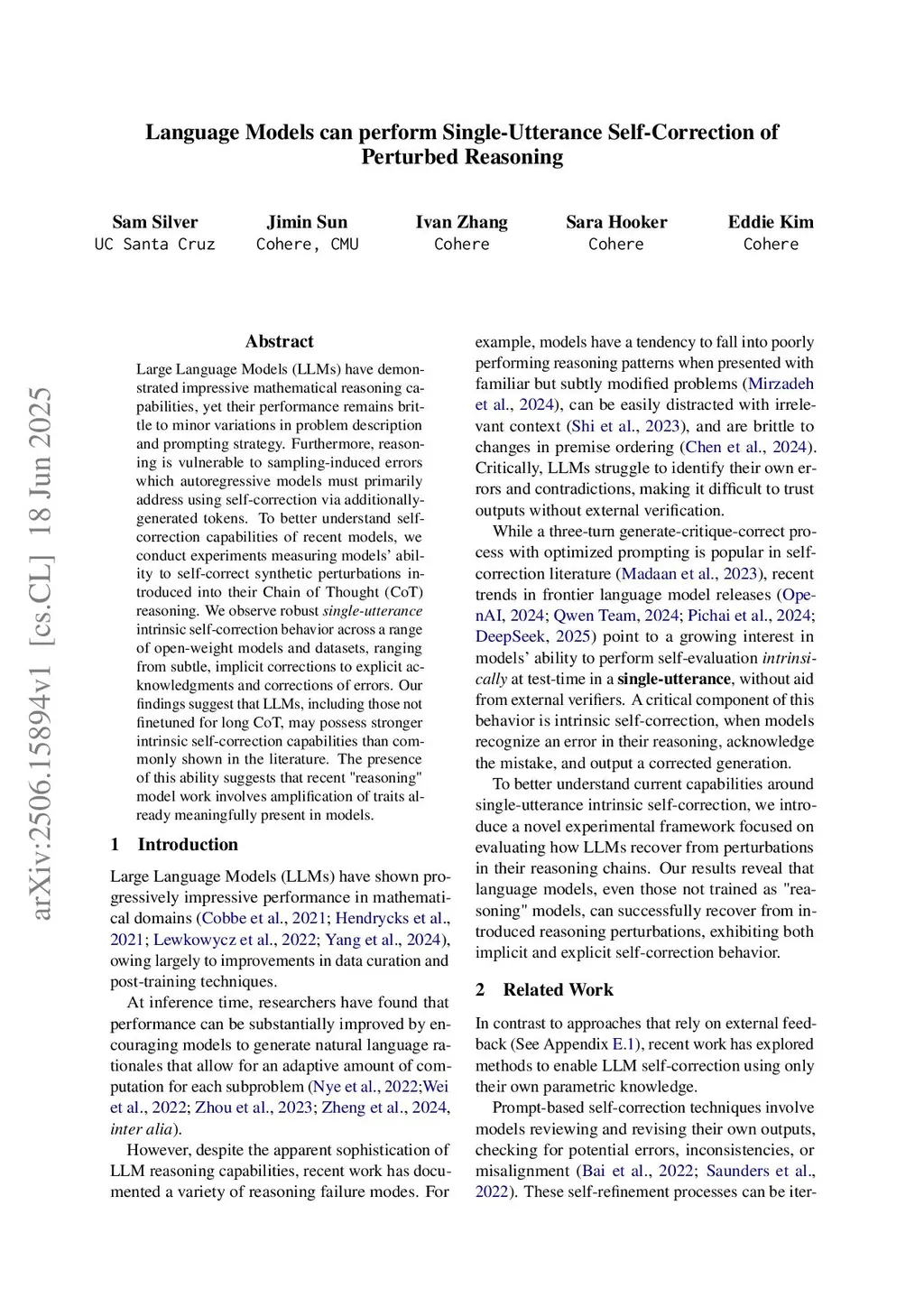 Language Models can perform Single-Utterance Self-Correction of Perturbed Reasoning
