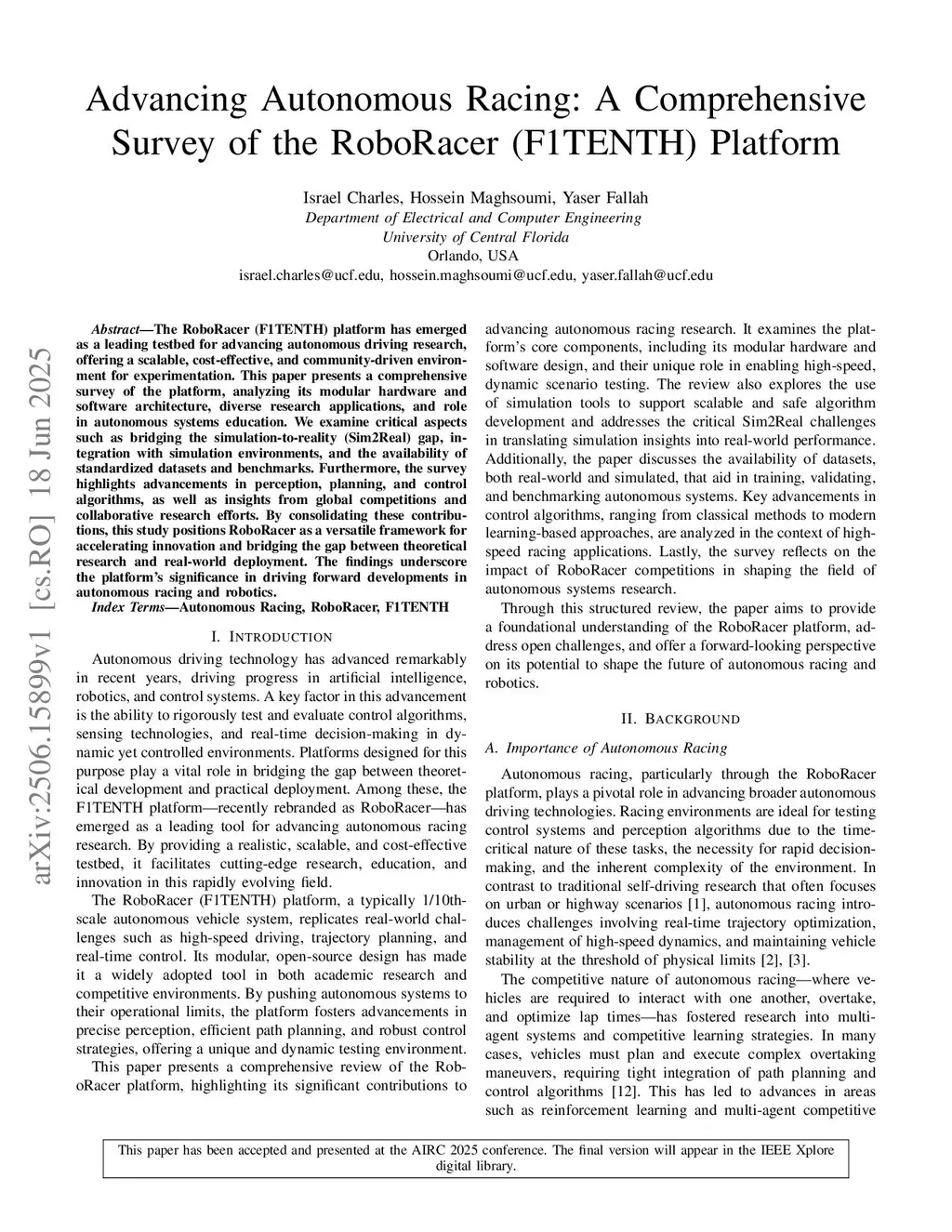 The RoboRacer (F1TENTH) platform has emerged as a leading testbed for advancing autonomous driving research, offering a scalable, cost-effective, and community-driven environment for experimentation. This paper presents a comprehensive survey of the platform, analyzing its modular hardware and software architecture, diverse research applications, and role in autonomous systems education. We examine critical aspects such as bridging the simulation-to-reality (Sim2Real) gap, integration with simulation environments, and the availability of standardized datasets and benchmarks. Furthermore, the survey highlights advancements in perception, planning, and control algorithms, as well as insights from global competitions and collaborative research efforts. By consolidating these contributions, this study positions RoboRacer as a versatile framework for accelerating innovation and bridging the gap between theoretical research and real-world deployment. The findings underscore the platform's significance in driving forward developments in autonomous racing and robotics.