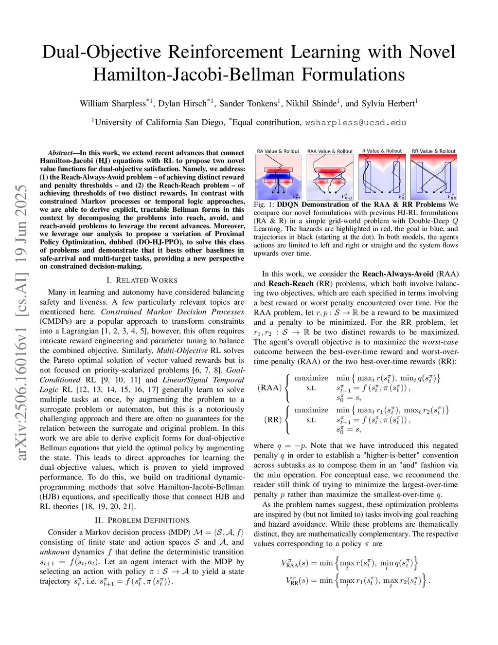 Dual-Objective Reinforcement Learning with Novel Hamilton-Jacobi-Bellman Formulations