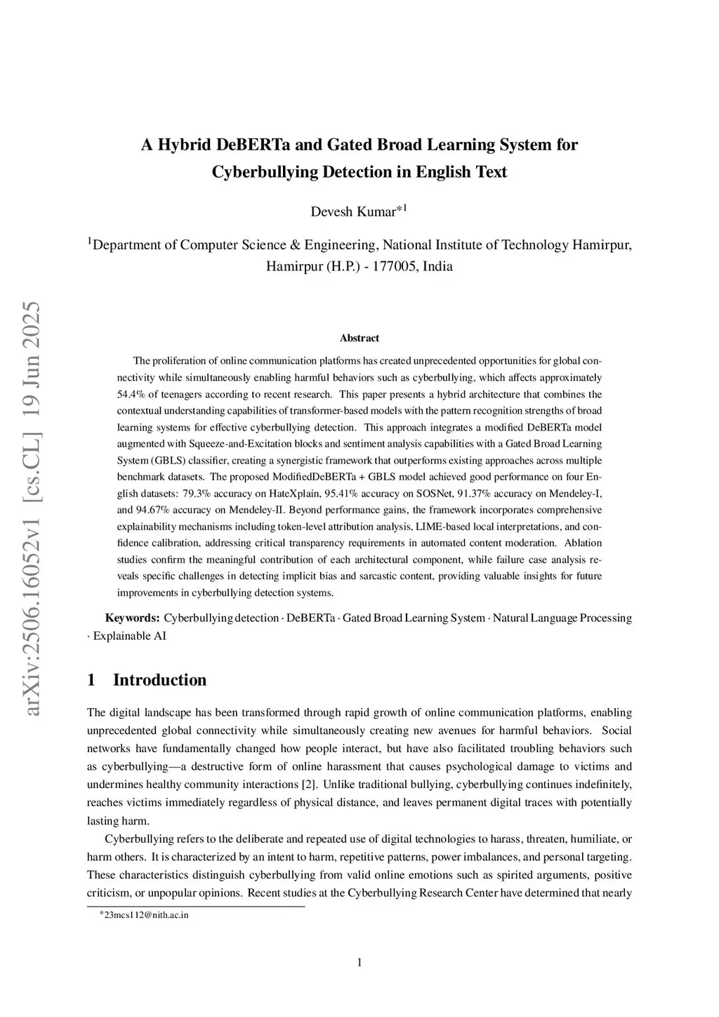 The proliferation of online communication platforms has created unprecedented opportunities for global connectivity while simultaneously enabling harmful behaviors such as cyberbullying, which affects approximately 54.4\% of teenagers according to recent research. This paper presents a hybrid architecture that combines the contextual understanding capabilities of transformer-based models with the pattern recognition strengths of broad learning systems for effective cyberbullying detection. This approach integrates a modified DeBERTa model augmented with Squeeze-and-Excitation blocks and sentiment analysis capabilities with a Gated Broad Learning System (GBLS) classifier, creating a synergistic framework that outperforms existing approaches across multiple benchmark datasets. The proposed ModifiedDeBERTa + GBLS model achieved good performance on four English datasets: 79.3\% accuracy on HateXplain, 95.41\% accuracy on SOSNet, 91.37\% accuracy on Mendeley-I, and 94.67\% accuracy on Mendeley-II. Beyond performance gains, the framework incorporates comprehensive explainability mechanisms including token-level attribution analysis, LIME-based local interpretations, and confidence calibration, addressing critical transparency requirements in automated content moderation. Ablation studies confirm the meaningful contribution of each architectural component, while failure case analysis reveals specific challenges in detecting implicit bias and sarcastic content, providing valuable insights for future improvements in cyberbullying detection systems.
