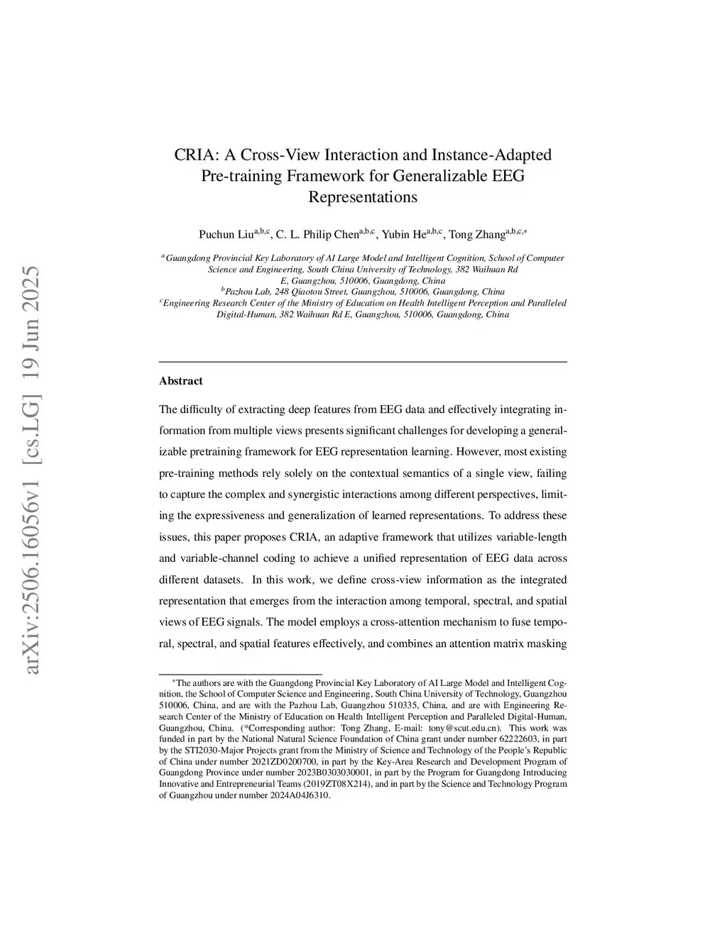 CRIA: A Cross-View Interaction and Instance-Adapted Pre-training Framework for Generalizable EEG Representations