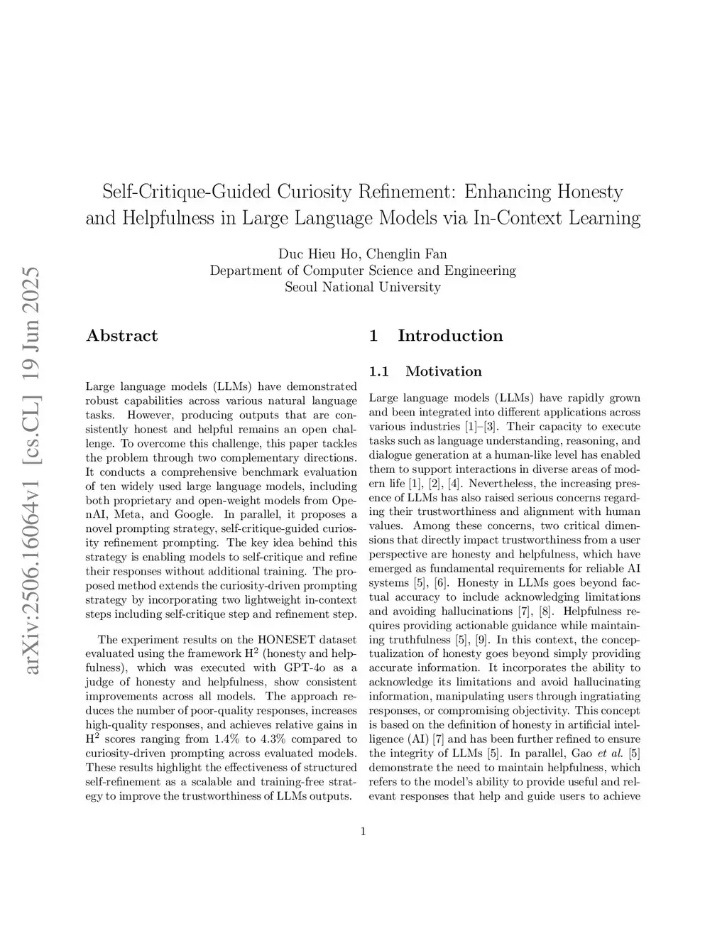 Large language models (LLMs) have demonstrated robust capabilities across various natural language tasks. However, producing outputs that are consistently honest and helpful remains an open challenge. To overcome this challenge, this paper tackles the problem through two complementary directions. It conducts a comprehensive benchmark evaluation of ten widely used large language models, including both proprietary and open-weight models from OpenAI, Meta, and Google. In parallel, it proposes a novel prompting strategy, self-critique-guided curiosity refinement prompting. The key idea behind this strategy is enabling models to self-critique and refine their responses without additional training. The proposed method extends the curiosity-driven prompting strategy by incorporating two lightweight in-context steps including self-critique step and refinement step.The experiment results on the HONESET dataset evaluated using the framework (honesty and helpfulness), which was executed with GPT-4o as a judge of honesty and helpfulness, show consistent improvements across all models. The approach reduces the number of poor-quality responses, increases high-quality responses, and achieves relative gains in scores ranging from 1.4% to 4.3% compared to curiosity-driven prompting across evaluated models. These results highlight the effectiveness of structured self-refinement as a scalable and training-free strategy to improve the trustworthiness of LLMs outputs.