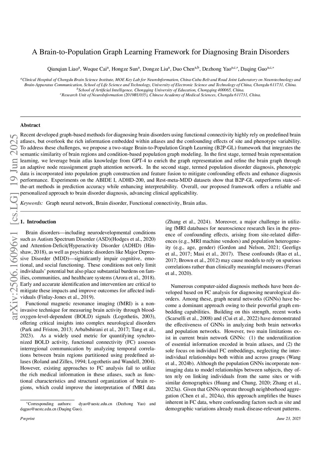 Recent developed graph-based methods for diagnosing brain disorders using functional connectivity highly rely on predefined brain atlases, but overlook the rich information embedded within atlases and the confounding effects of site and phenotype variability. To address these challenges, we propose a two-stage Brain-to-Population Graph Learning (B2P-GL) framework that integrates the semantic similarity of brain regions and condition-based population graph modeling. In the first stage, termed brain representation learning, we leverage brain atlas knowledge from GPT-4 to enrich the graph representation and refine the brain graph through an adaptive node reassignment graph attention network. In the second stage, termed population disorder diagnosis, phenotypic data is incorporated into population graph construction and feature fusion to mitigate confounding effects and enhance diagnosis performance. Experiments on the ABIDE I, ADHD-200, and Rest-meta-MDD datasets show that B2P-GL outperforms state-of-the-art methods in prediction accuracy while enhancing interpretability. Overall, our proposed framework offers a reliable and personalized approach to brain disorder diagnosis, advancing clinical applicability.
