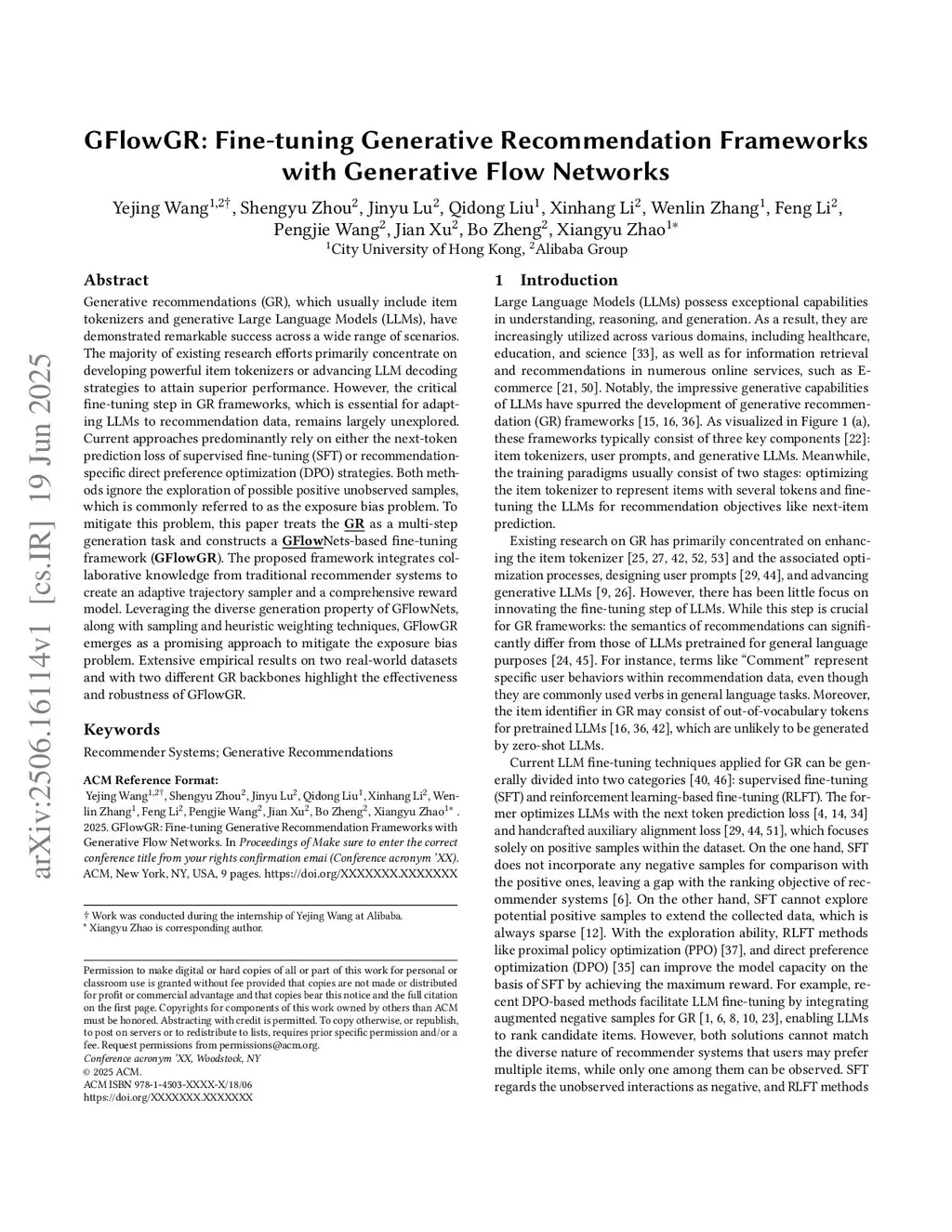 Generative recommendations (GR), which usually include item tokenizers and generative Large Language Models (LLMs), have demonstrated remarkable success across a wide range of scenarios. The majority of existing research efforts primarily concentrate on developing powerful item tokenizers or advancing LLM decoding strategies to attain superior performance. However, the critical fine-tuning step in GR frameworks, which is essential for adapting LLMs to recommendation data, remains largely unexplored. Current approaches predominantly rely on either the next-token prediction loss of supervised fine-tuning (SFT) or recommendationspecific direct preference optimization (DPO) strategies. Both methods ignore the exploration of possible positive unobserved samples, which is commonly referred to as the exposure bias problem. To mitigate this problem, this paper treats the GR as a multi-step generation task and constructs a GFlowNets-based fine-tuning framework (GFlowGR). The proposed framework integrates collaborative knowledge from traditional recommender systems to create an adaptive trajectory sampler and a comprehensive reward model. Leveraging the diverse generation property of GFlowNets, along with sampling and heuristic weighting techniques, GFlowGR emerges as a promising approach to mitigate the exposure bias problem. Extensive empirical results on two real-world datasets and with two different GR backbones highlight the effectiveness and robustness of GFlowGR.