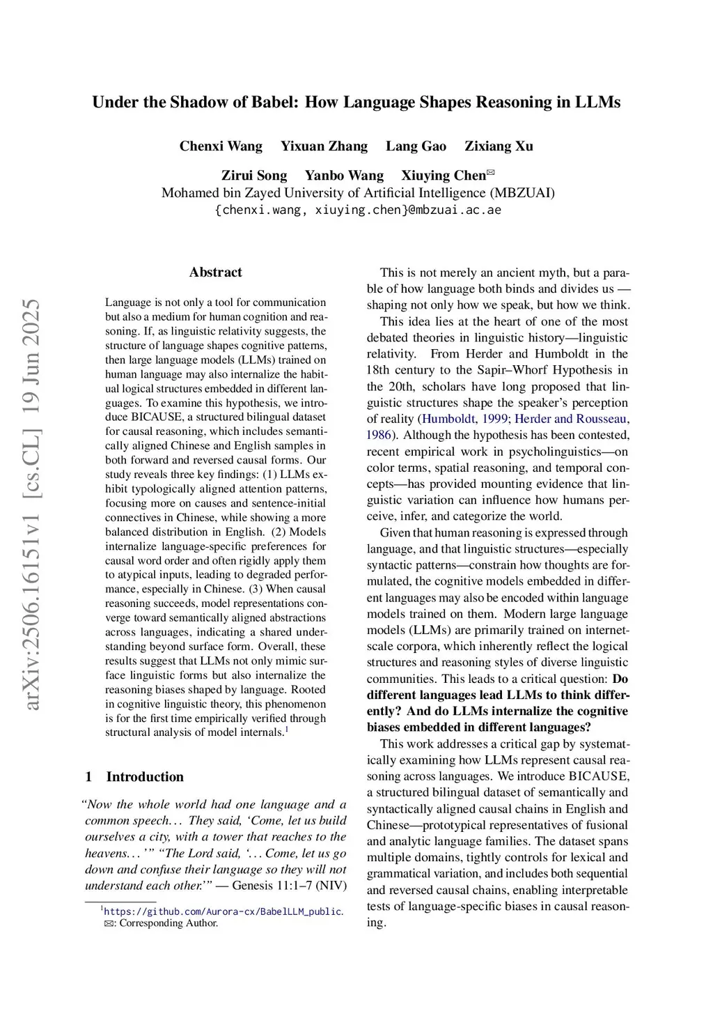 Language is not only a tool for communication but also a medium for human cognition and reasoning. If, as linguistic relativity suggests, the structure of language shapes cognitive patterns, then large language models (LLMs) trained on human language may also internalize the habitual logical structures embedded in different languages. To examine this hypothesis, we introduce BICAUSE, a structured bilingual dataset for causal reasoning, which includes semantically aligned Chinese and English samples in both forward and reversed causal forms. Our study reveals three key findings: (1) LLMs exhibit typologically aligned attention patterns, focusing more on causes and sentence-initial connectives in Chinese, while showing a more balanced distribution in English. (2) Models internalize language-specific preferences for causal word order and often rigidly apply them to atypical inputs, leading to degraded performance, especially in Chinese. (3) When causal reasoning succeeds, model representations converge toward semantically aligned abstractions across languages, indicating a shared understanding beyond surface form. Overall, these results suggest that LLMs not only mimic surface linguistic forms but also internalize the reasoning biases shaped by language. Rooted in cognitive linguistic theory, this phenomenon is for the first time empirically verified through structural analysis of model internals.