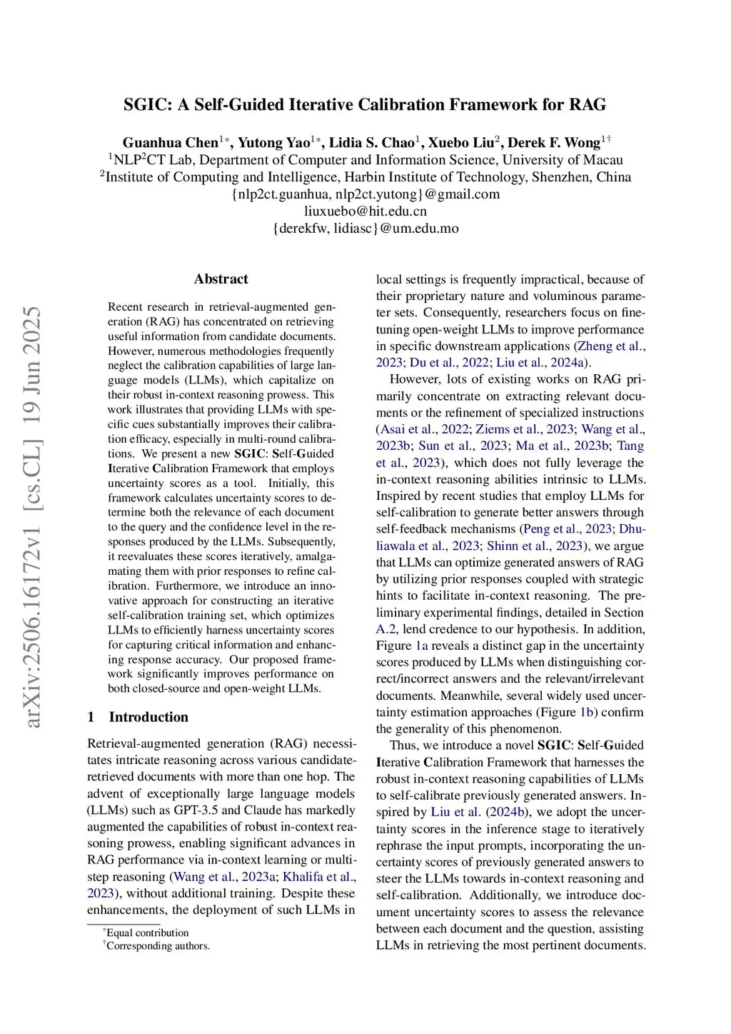 Recent research in retrieval-augmented generation (RAG) has concentrated on retrieving useful information from candidate documents. However, numerous methodologies frequently neglect the calibration capabilities of large language models (LLMs), which capitalize on their robust in-context reasoning prowess. This work illustrates that providing LLMs with specific cues substantially improves their calibration efficacy, especially in multi-round calibrations. We present a new SGIC: Self-Guided Iterative Calibration Framework that employs uncertainty scores as a tool. Initially, this framework calculates uncertainty scores to determine both the relevance of each document to the query and the confidence level in the responses produced by the LLMs. Subsequently, it reevaluates these scores iteratively, amalgamating them with prior responses to refine calibration. Furthermore, we introduce an innovative approach for constructing an iterative self-calibration training set, which optimizes LLMs to efficiently harness uncertainty scores for capturing critical information and enhancing response accuracy. Our proposed framework significantly improves performance on both closed-source and open-weight LLMs.