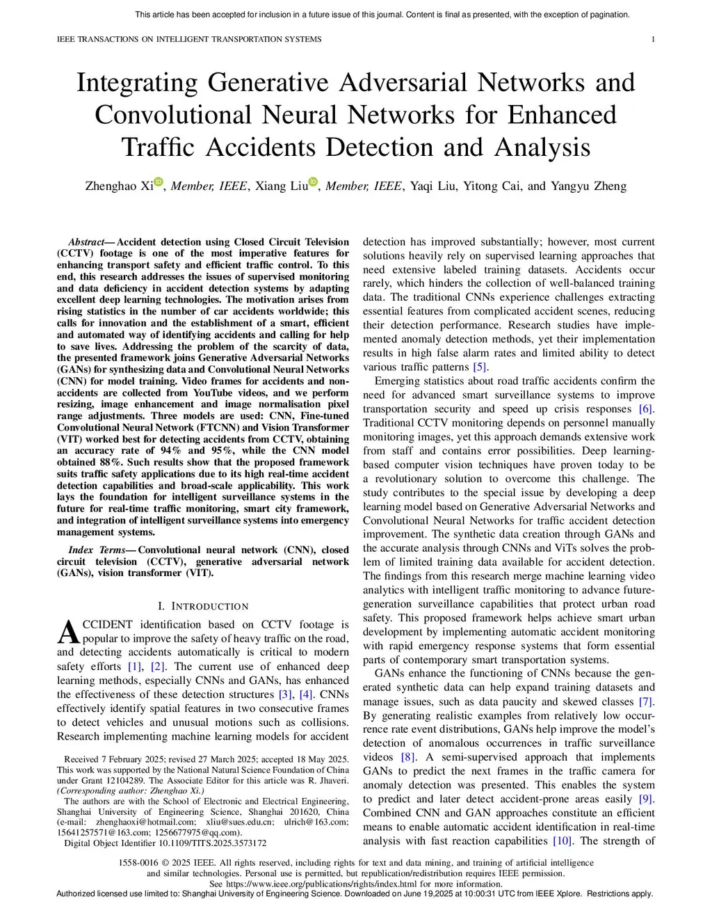 Accident detection using Closed Circuit Television (CCTV) footage is one of the most imperative features for enhancing transport safety and efficient traffic control. To this end, this research addresses the issues of supervised monitoring and data deficiency in accident detection systems by adapting excellent deep learning technologies. The motivation arises from rising statistics in the number of car accidents worldwide; this calls for innovation and the establishment of a smart, efficient and automated way of identifying accidents and calling for help to save lives. Addressing the problem of the scarcity of data, the presented framework joins Generative Adversarial Networks (GANs) for synthesizing data and Convolutional Neural Networks (CNN) for model training. Video frames for accidents and non-accidents are collected from YouTube videos, and we perform resizing, image enhancement and image normalisation pixel range adjustments. Three models are used: CNN, Fine-tuned Convolutional Neural Network (FTCNN) and Vision Transformer (VIT) worked best for detecting accidents from CCTV, obtaining an accuracy rate of 94% and 95%, while the CNN model obtained 88%. Such results show that the proposed framework suits traffic safety applications due to its high real-time accident detection capabilities and broad-scale applicability. This work lays the foundation for intelligent surveillance systems in the future for real-time traffic monitoring, smart city framework, and integration of intelligent surveillance systems into emergency management systems.