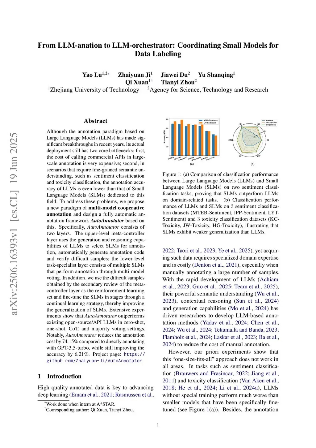 Although the annotation paradigm based on Large Language Models (LLMs) has made significant breakthroughs in recent years, its actual deployment still has two core bottlenecks: first, the cost of calling commercial APIs in large-scale annotation is very expensive; second, in scenarios that require fine-grained semantic understanding, such as sentiment classification and toxicity classification, the annotation accuracy of LLMs is even lower than that of Small Language Models (SLMs) dedicated to this field. To address these problems, we propose a new paradigm of multi-model cooperative annotation and design a fully automatic annotation framework AutoAnnotator based on this. Specifically, AutoAnnotator consists of two layers. The upper-level meta-controller layer uses the generation and reasoning capabilities of LLMs to select SLMs for annotation, automatically generate annotation code and verify difficult samples; the lower-level task-specialist layer consists of multiple SLMs that perform annotation through multi-model voting. In addition, we use the difficult samples obtained by the secondary review of the meta-controller layer as the reinforcement learning set and fine-tune the SLMs in stages through a continual learning strategy, thereby improving the generalization of SLMs. Extensive experiments show that AutoAnnotator outperforms existing open-source/API LLMs in zero-shot, one-shot, CoT, and majority voting settings. Notably, AutoAnnotator reduces the annotation cost by 74.15% compared to directly annotating with GPT-3.5-turbo, while still improving the accuracy by 6.21%. Project page:this https URL.