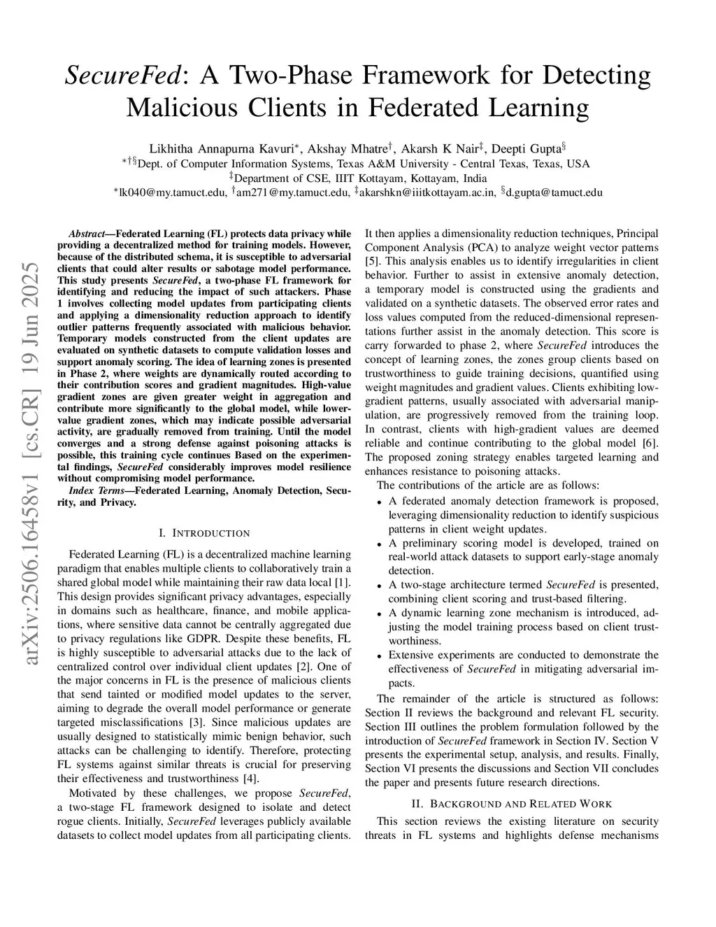 Federated Learning (FL) protects data privacy while providing a decentralized method for training models. However, because of the distributed schema, it is susceptible to adversarial clients that could alter results or sabotage model performance. This study presents SecureFed, a two-phase FL framework for identifying and reducing the impact of such attackers. Phase 1 involves collecting model updates from participating clients and applying a dimensionality reduction approach to identify outlier patterns frequently associated with malicious behavior. Temporary models constructed from the client updates are evaluated on synthetic datasets to compute validation losses and support anomaly scoring. The idea of learning zones is presented in Phase 2, where weights are dynamically routed according to their contribution scores and gradient magnitudes. High-value gradient zones are given greater weight in aggregation and contribute more significantly to the global model, while lower-value gradient zones, which may indicate possible adversarial activity, are gradually removed from training. Until the model converges and a strong defense against poisoning attacks is possible, this training cycle continues Based on the experimental findings, SecureFed considerably improves model resilience without compromising model performance.