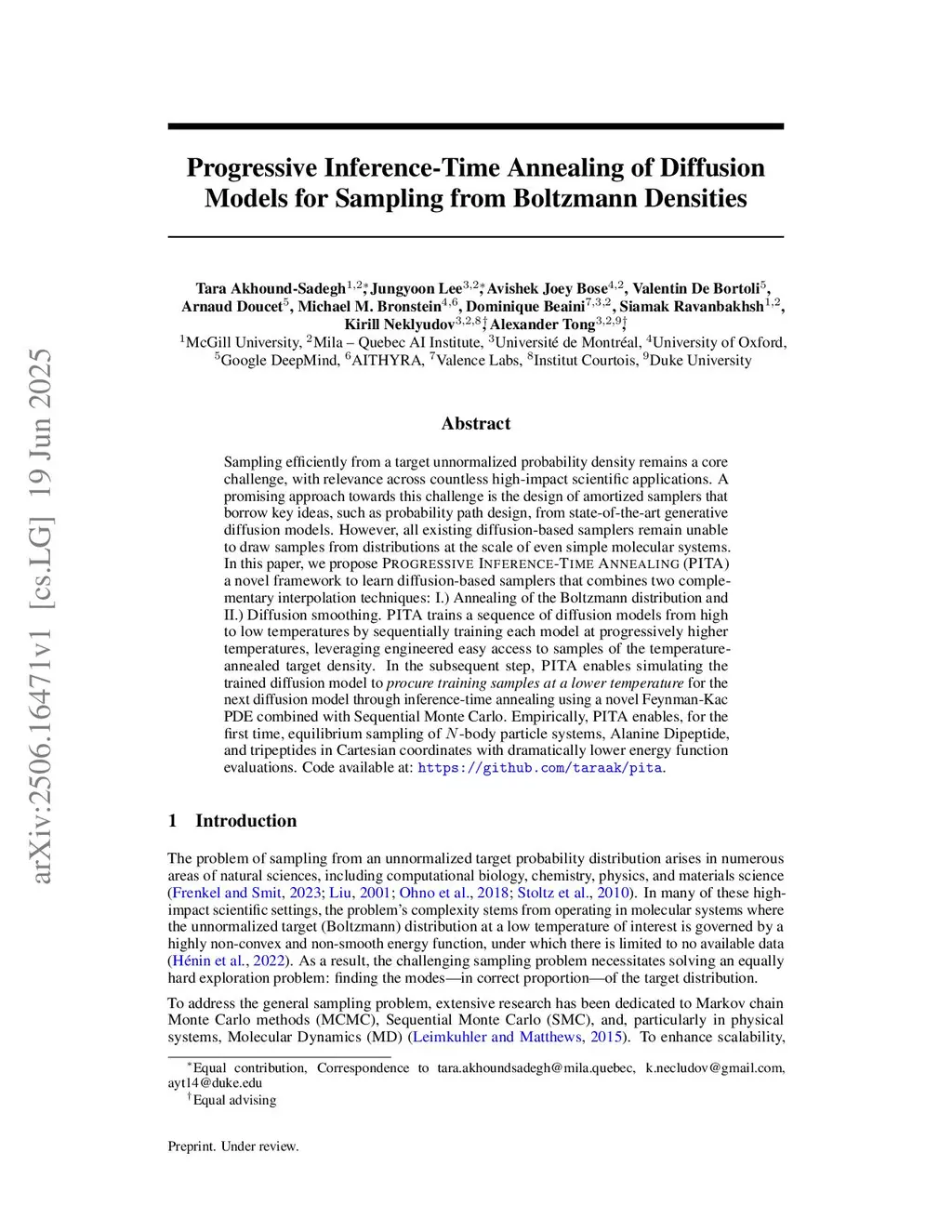 Sampling efficiently from a target unnormalized probability density remains a core challenge, with relevance across countless high-impact scientific applications. A promising approach towards this challenge is the design of amortized samplers that borrow key ideas, such as probability path design, from state-of-the-art generative diffusion models. However, all existing diffusion-based samplers remain unable to draw samples from distributions at the scale of even simple molecular systems. In this paper, we propose Progressive Inference-Time Annealing (PITA), a novel framework to learn diffusion-based samplers that combines two complementary interpolation techniques: I.) Annealing of the Boltzmann distribution and II.) Diffusion smoothing. PITA trains a sequence of diffusion models from high to low temperatures by sequentially training each model at progressively higher temperatures, leveraging engineered easy access to samples of the temperature-annealed target density. In the subsequent step, PITA enables simulating the trained diffusion model to procure training samples at a lower temperature for the next diffusion model through inference-time annealing using a novel Feynman-Kac PDE combined with Sequential Monte Carlo. Empirically, PITA enables, for the first time, equilibrium sampling of N-body particle systems, Alanine Dipeptide, and tripeptides in Cartesian coordinates with dramatically lower energy function evaluations. Code available at:this https URL