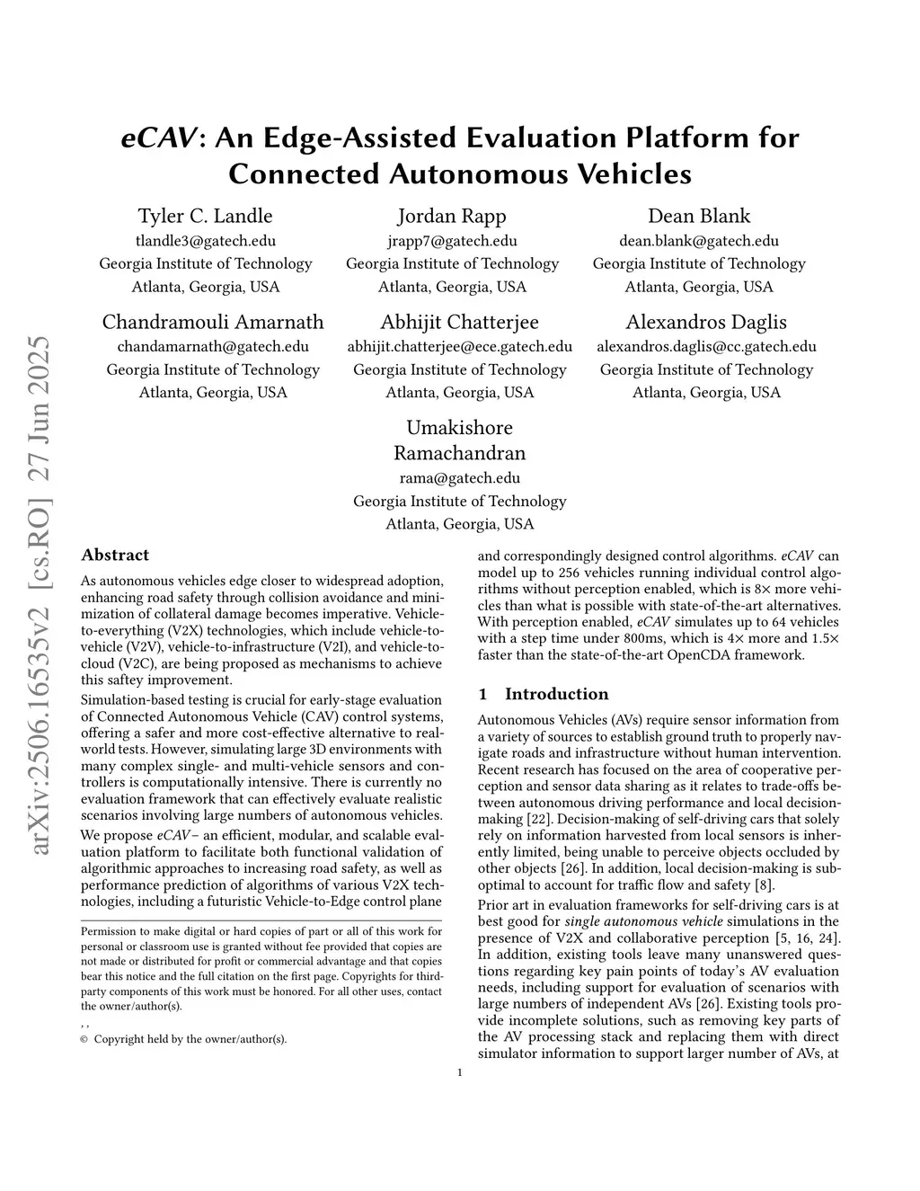 As autonomous vehicles edge closer to widespread adoption, enhancing road safety through collision avoidance and minimization of collateral damage becomes imperative. Vehicle-to-everything (V2X) technologies, which include vehicle-to-vehicle (V2V), vehicle-to-infrastructure (V2I), and vehicle-to-cloud (V2C), are being proposed as mechanisms to achieve this safety improvement.Simulation-based testing is crucial for early-stage evaluation of Connected Autonomous Vehicle (CAV) control systems, offering a safer and more cost-effective alternative to real-world tests. However, simulating large 3D environments with many complex single- and multi-vehicle sensors and controllers is computationally intensive. There is currently no evaluation framework that can effectively evaluate realistic scenarios involving large numbers of autonomous vehicles.We propose eCAV -- an efficient, modular, and scalable evaluation platform to facilitate both functional validation of algorithmic approaches to increasing road safety, as well as performance prediction of algorithms of various V2X technologies, including a futuristic Vehicle-to-Edge control plane and correspondingly designed control algorithms. eCAV can model up to 256 vehicles running individual control algorithms without perception enabled, which is more vehicles than what is possible with state-of-the-art alternatives.