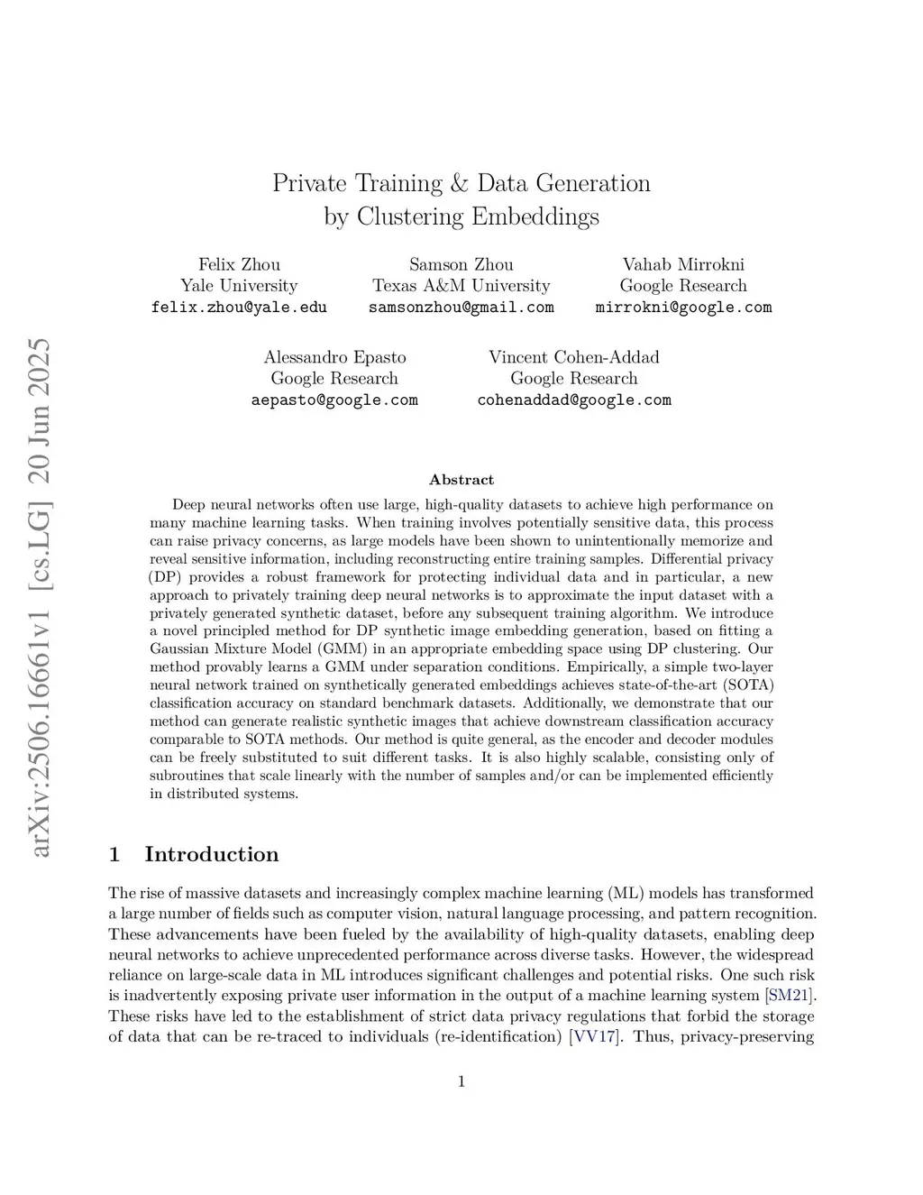 Private Training & Data Generation by Clustering Embeddings