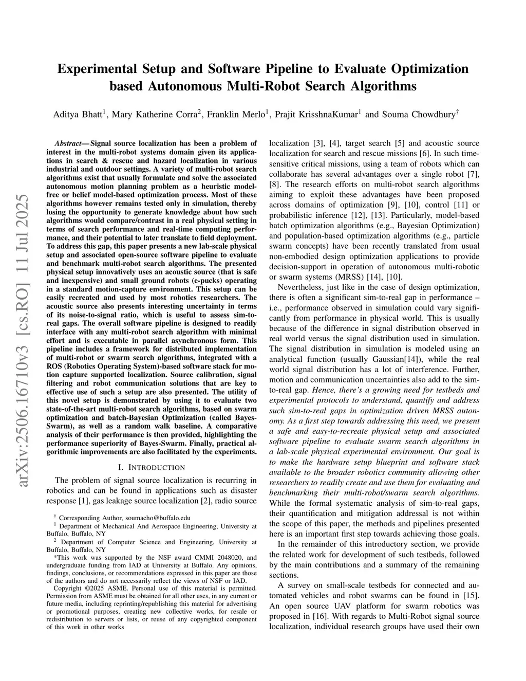 Experimental Setup and Software Pipeline to Evaluate Optimization based Autonomous Multi-Robot Search Algorithms