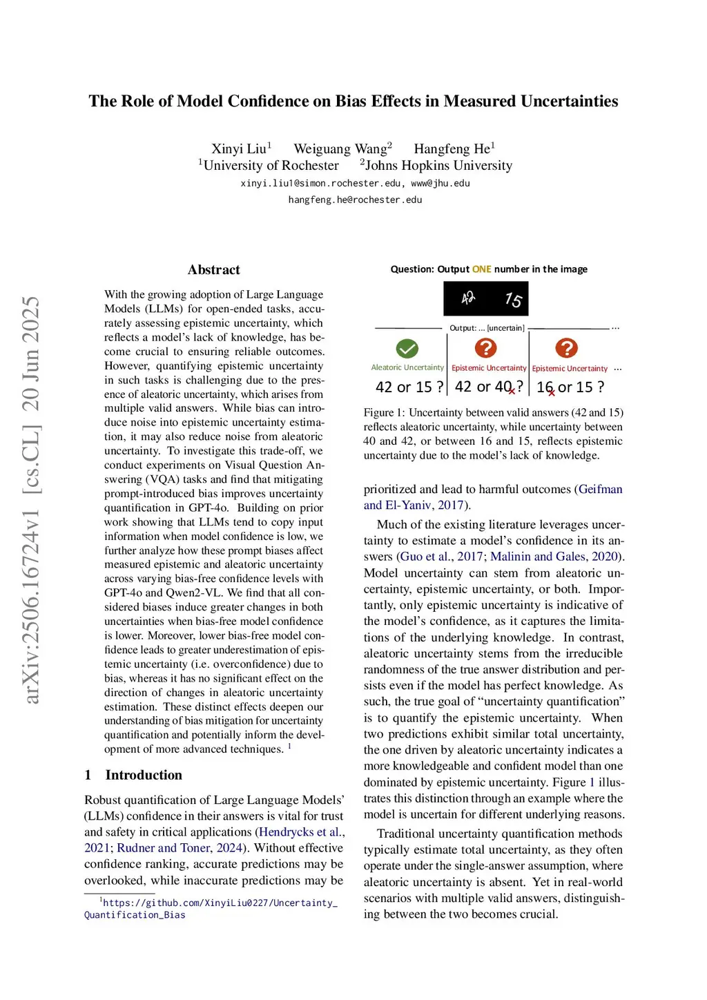 With the growing adoption of Large Language Models (LLMs) for open-ended tasks, accurately assessing epistemic uncertainty, which reflects a model's lack of knowledge, has become crucial to ensuring reliable outcomes. However, quantifying epistemic uncertainty in such tasks is challenging due to the presence of aleatoric uncertainty, which arises from multiple valid answers. While bias can introduce noise into epistemic uncertainty estimation, it may also reduce noise from aleatoric uncertainty. To investigate this trade-off, we conduct experiments on Visual Question Answering (VQA) tasks and find that mitigating prompt-introduced bias improves uncertainty quantification in GPT-4o. Building on prior work showing that LLMs tend to copy input information when model confidence is low, we further analyze how these prompt biases affect measured epistemic and aleatoric uncertainty across varying bias-free confidence levels with GPT-4o and Qwen2-VL. We find that all considered biases have greater effects in both uncertainties when bias-free model confidence is lower. Moreover, lower bias-free model confidence is associated with greater bias-induced underestimation of epistemic uncertainty, resulting in overconfident estimates, whereas it has no significant effect on the direction of bias effect in aleatoric uncertainty estimation. These distinct effects deepen our understanding of bias mitigation for uncertainty quantification and potentially inform the development of more advanced techniques.