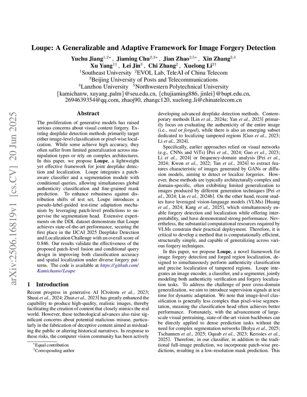 The proliferation of generative models has raised serious concerns about visual content forgery. Existing deepfake detection methods primarily target either image-level classification or pixel-wise localization. While some achieve high accuracy, they often suffer from limited generalization across manipulation types or rely on complex architectures. In this paper, we propose Loupe, a lightweight yet effective framework for joint deepfake detection and localization. Loupe integrates a patch-aware classifier and a segmentation module with conditional queries, allowing simultaneous global authenticity classification and fine-grained mask prediction. To enhance robustness against distribution shifts of test set, Loupe introduces a pseudo-label-guided test-time adaptation mechanism by leveraging patch-level predictions to supervise the segmentation head. Extensive experiments on the DDL dataset demonstrate that Loupe achieves state-of-the-art performance, securing the first place in the IJCAI 2025 Deepfake Detection and Localization Challenge with an overall score of 0.846. Our results validate the effectiveness of the proposed patch-level fusion and conditional query design in improving both classification accuracy and spatial localization under diverse forgery patterns. The code is available atthis https URL.