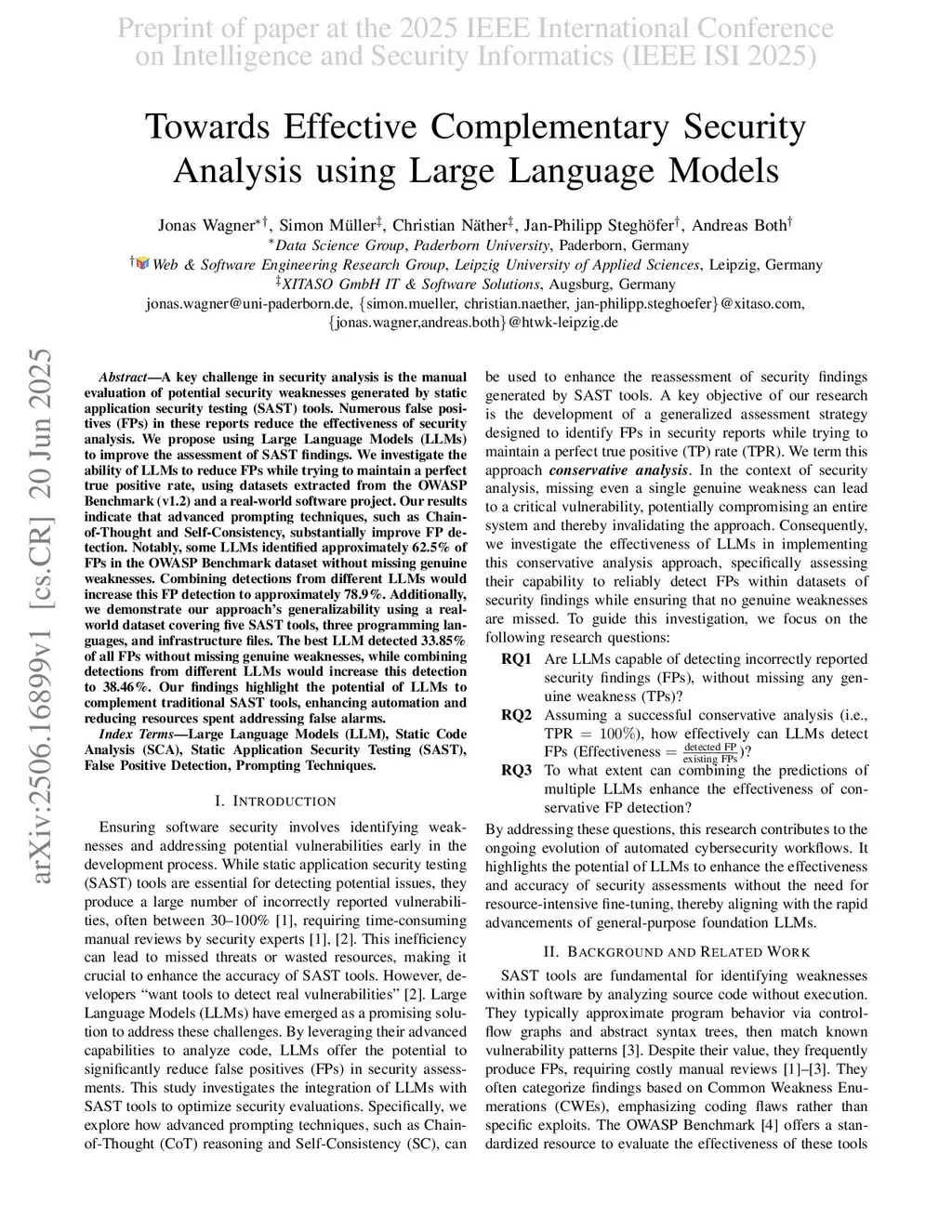 A key challenge in security analysis is the manual evaluation of potential security weaknesses generated by static application security testing (SAST) tools. Numerous false positives (FPs) in these reports reduce the effectiveness of security analysis. We propose using Large Language Models (LLMs) to improve the assessment of SAST findings. We investigate the ability of LLMs to reduce FPs while trying to maintain a perfect true positive rate, using datasets extracted from the OWASP Benchmark (v1.2) and a real-world software project. Our results indicate that advanced prompting techniques, such as Chain-of-Thought and Self-Consistency, substantially improve FP detection. Notably, some LLMs identified approximately 62.5% of FPs in the OWASP Benchmark dataset without missing genuine weaknesses. Combining detections from different LLMs would increase this FP detection to approximately 78.9%. Additionally, we demonstrate our approach's generalizability using a real-world dataset covering five SAST tools, three programming languages, and infrastructure files. The best LLM detected 33.85% of all FPs without missing genuine weaknesses, while combining detections from different LLMs would increase this detection to 38.46%. Our findings highlight the potential of LLMs to complement traditional SAST tools, enhancing automation and reducing resources spent addressing false alarms.