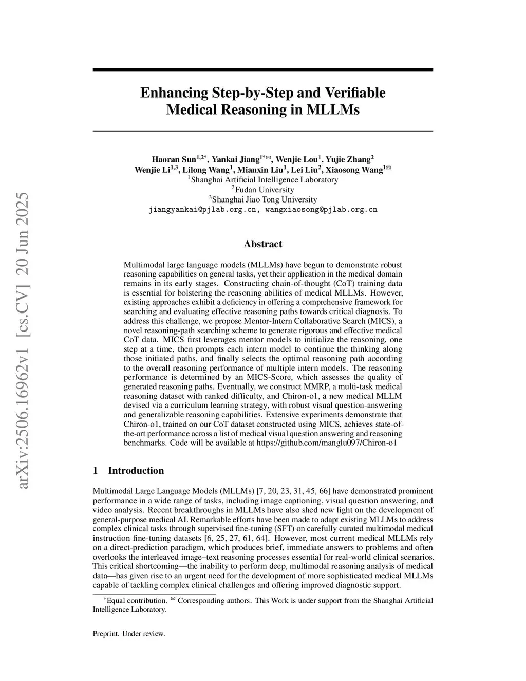 Multimodal large language models (MLLMs) have begun to demonstrate robust reasoning capabilities on general tasks, yet their application in the medical domain remains in its early stages. Constructing chain-of-thought (CoT) training data is essential for bolstering the reasoning abilities of medical MLLMs. However, existing approaches exhibit a deficiency in offering a comprehensive framework for searching and evaluating effective reasoning paths towards critical diagnosis. To address this challenge, we propose Mentor-Intern Collaborative Search (MICS), a novel reasoning-path searching scheme to generate rigorous and effective medical CoT data. MICS first leverages mentor models to initialize the reasoning, one step at a time, then prompts each intern model to continue the thinking along those initiated paths, and finally selects the optimal reasoning path according to the overall reasoning performance of multiple intern models. The reasoning performance is determined by an MICS-Score, which assesses the quality of generated reasoning paths. Eventually, we construct MMRP, a multi-task medical reasoning dataset with ranked difficulty, and Chiron-o1, a new medical MLLM devised via a curriculum learning strategy, with robust visual question-answering and generalizable reasoning capabilities. Extensive experiments demonstrate that Chiron-o1, trained on our CoT dataset constructed using MICS, achieves state-of-the-art performance across a list of medical visual question answering and reasoning benchmarks. Codes are available atthis https URL