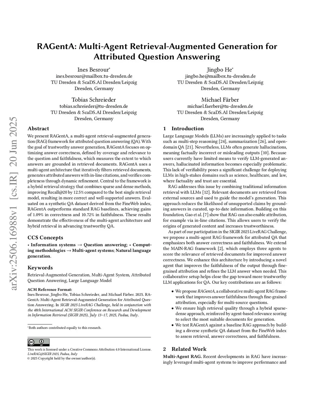 We present RAGentA, a multi-agent retrieval-augmented generation (RAG) framework for attributed question answering (QA) with large language models (LLMs). With the goal of trustworthy answer generation, RAGentA focuses on optimizing answer correctness, defined by coverage and relevance to the question and faithfulness, which measures the extent to which answers are grounded in retrieved documents. RAGentA uses a multi-agent architecture that iteratively filters retrieved documents, generates attributed answers with in-line citations, and verifies completeness through dynamic refinement. Central to the framework is a hybrid retrieval strategy that combines sparse and dense methods, improving Recall@20 by 12.5% compared to the best single retrieval model, resulting in more correct and well-supported answers. Evaluated on a synthetic QA dataset derived from the FineWeb index, RAGentA outperforms standard RAG baselines, achieving gains of 1.09% in correctness and 10.72% in faithfulness. These results demonstrate the effectiveness of our multi-agent RAG architecture and hybrid retrieval strategy in advancing trustworthy QA with LLMs.